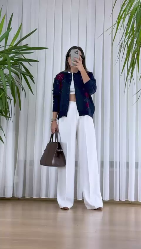 Beyaz Palazzo Pantolon - Yüksek Bel Geniş Paça Kumaş