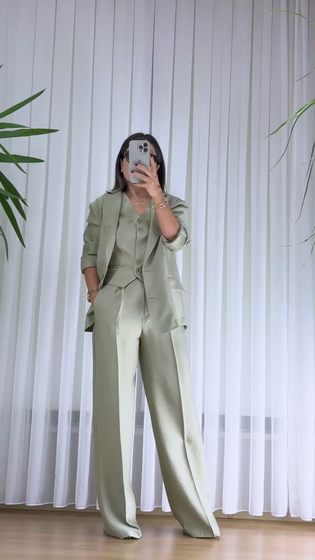 Küf Yeşili Bayan 3'lü Takım - Tensel Kumaş Ceket Yelek Set