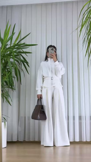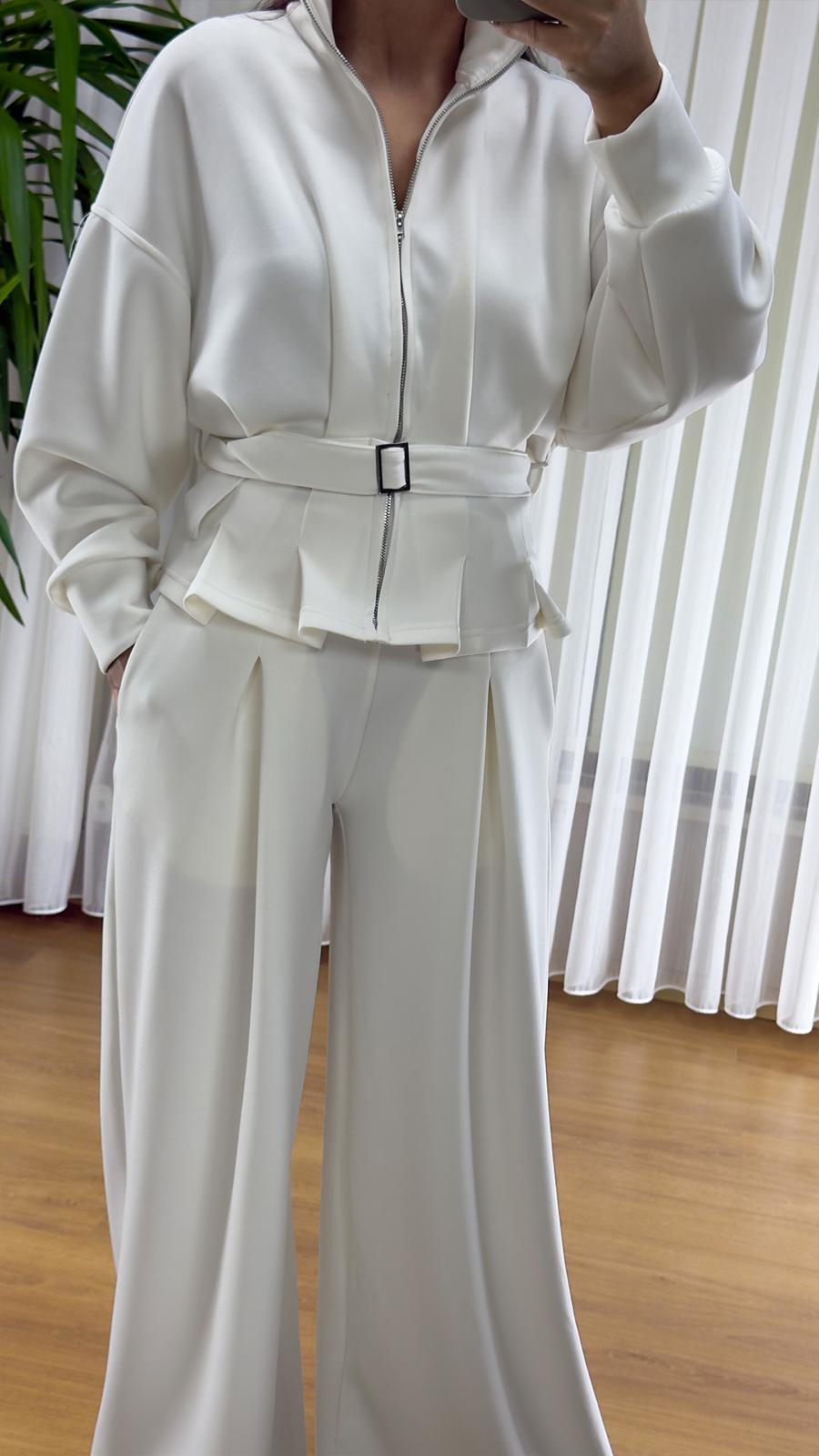 İkili takım, fermuarlı sweatshirt ve beli büzgülü rahat pantolon olmak üzere iki parçadan oluşuyor. Sweatshirt üzerindeki bel detayı ve fermuar kapama, modern bir görünüm katarken pratik kullanım sağlıyor. Pantolon bol kesim ve geniş paçasıyla rahat hareket imkanı sunuyor.
