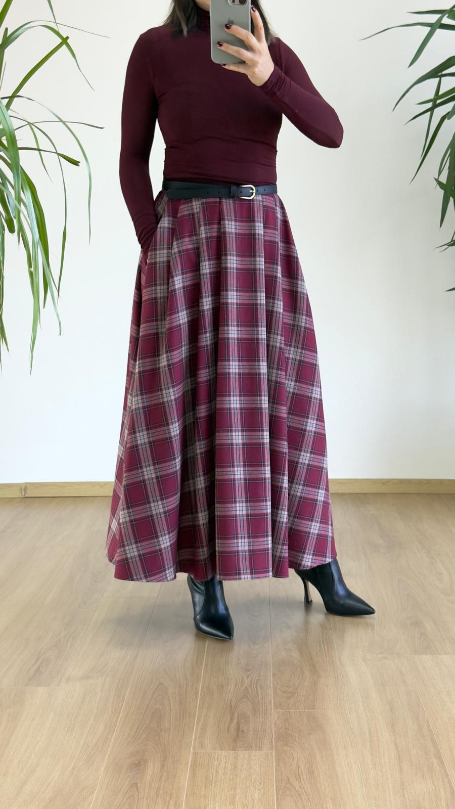 Vintage zarafetin ve modern tarzın mükemmel buluşması olan bordo ekose etek ile stilinize İskoç şıklığı katın. Klasik ekose desen ve pileli maxi boy kesimiyle hem retro hem de feminine bir görünüm sunan bu özel etek, kış aylarının en zarif parçası.