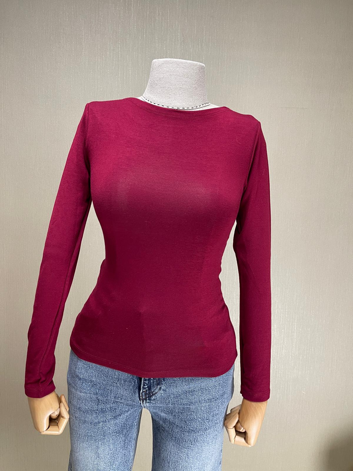 Şık bordo renkli uzun kollu bluz, kayık yaka detayı ve vücudu saran kesimi ile zarif bir görünüm sunar.