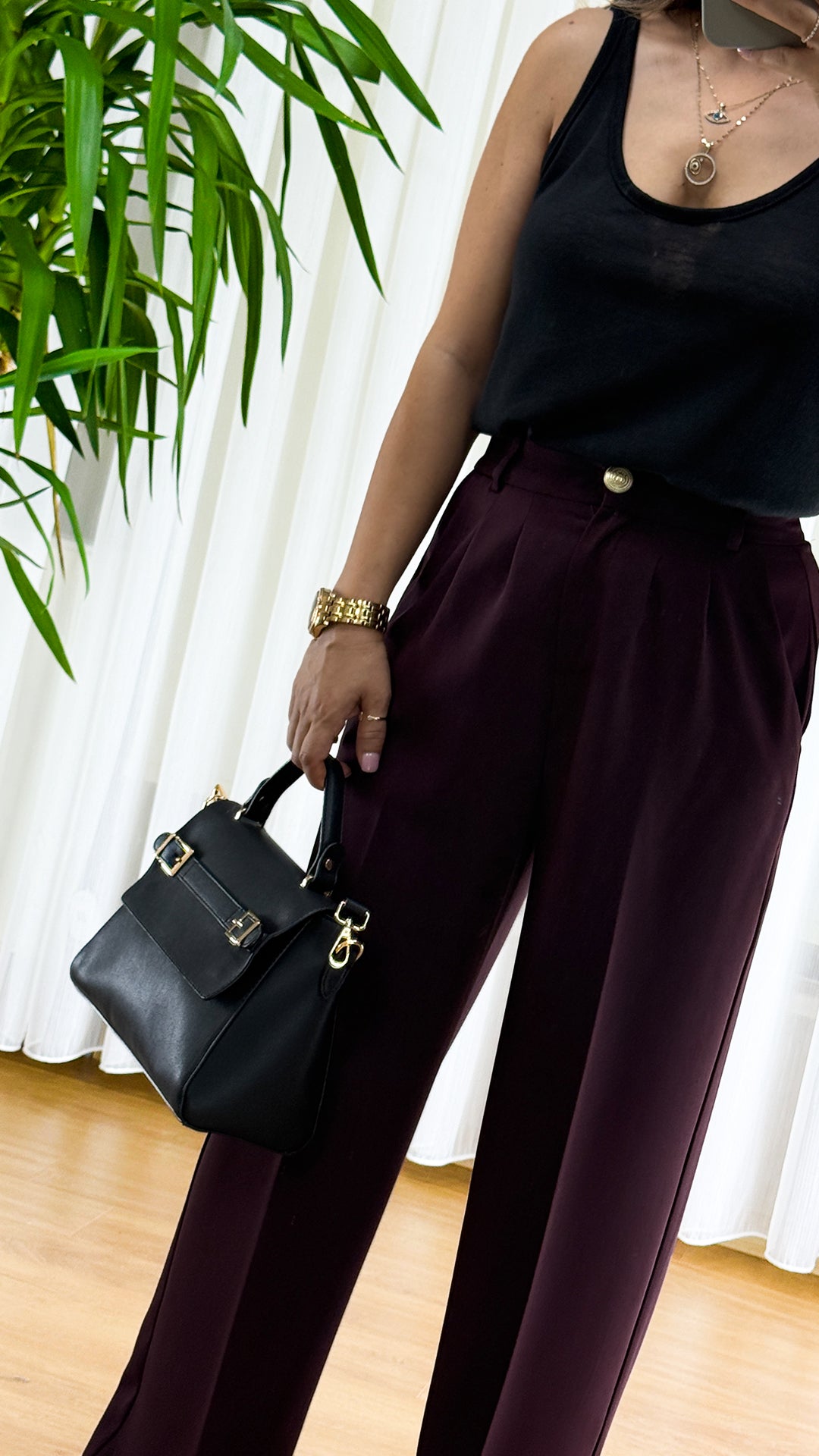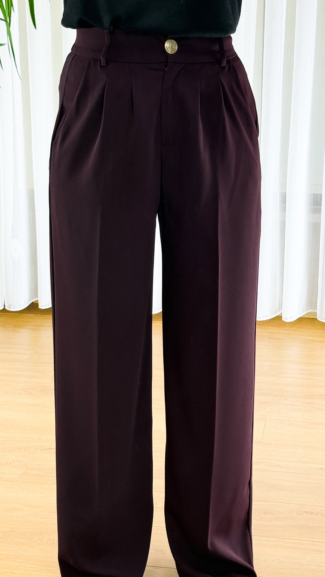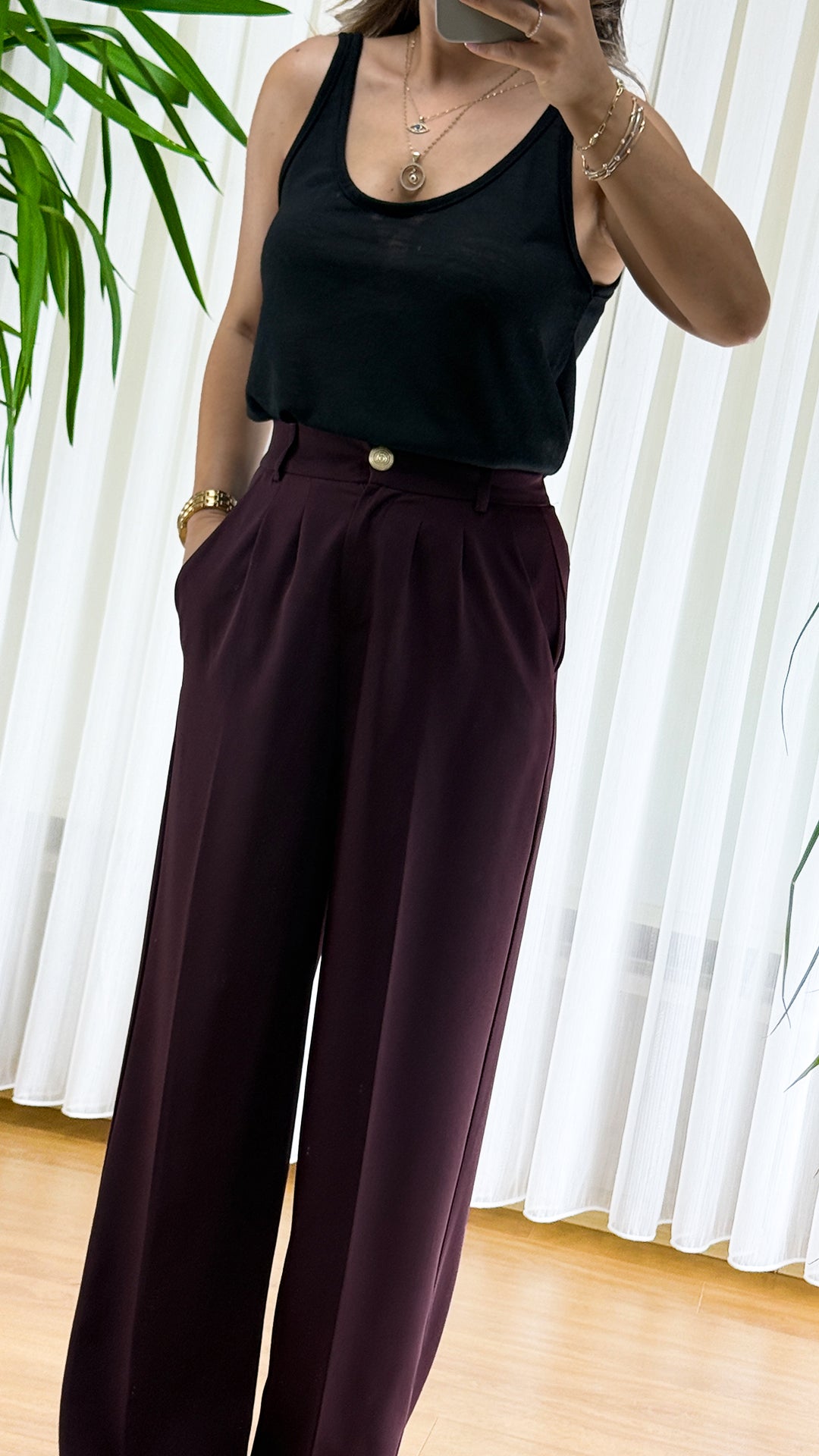 Bel kısmındaki structured pileler pantolona polished bir görünüm kazandırırken, wide leg kesimin elegant drape'i maksimum konfor ve movement sağlıyor. Altın rengi düğme detayı ve bordonun jewel tone intensity'si, autumn wardrobe'un luxurious foundation'ını yaratıyor.