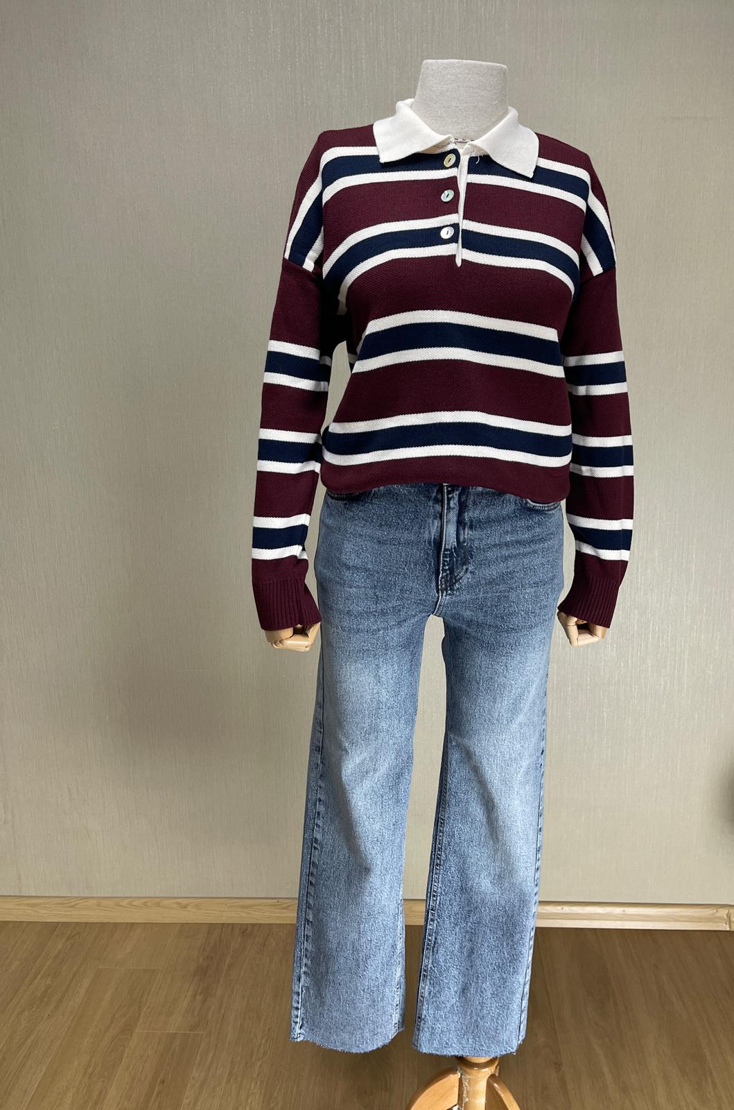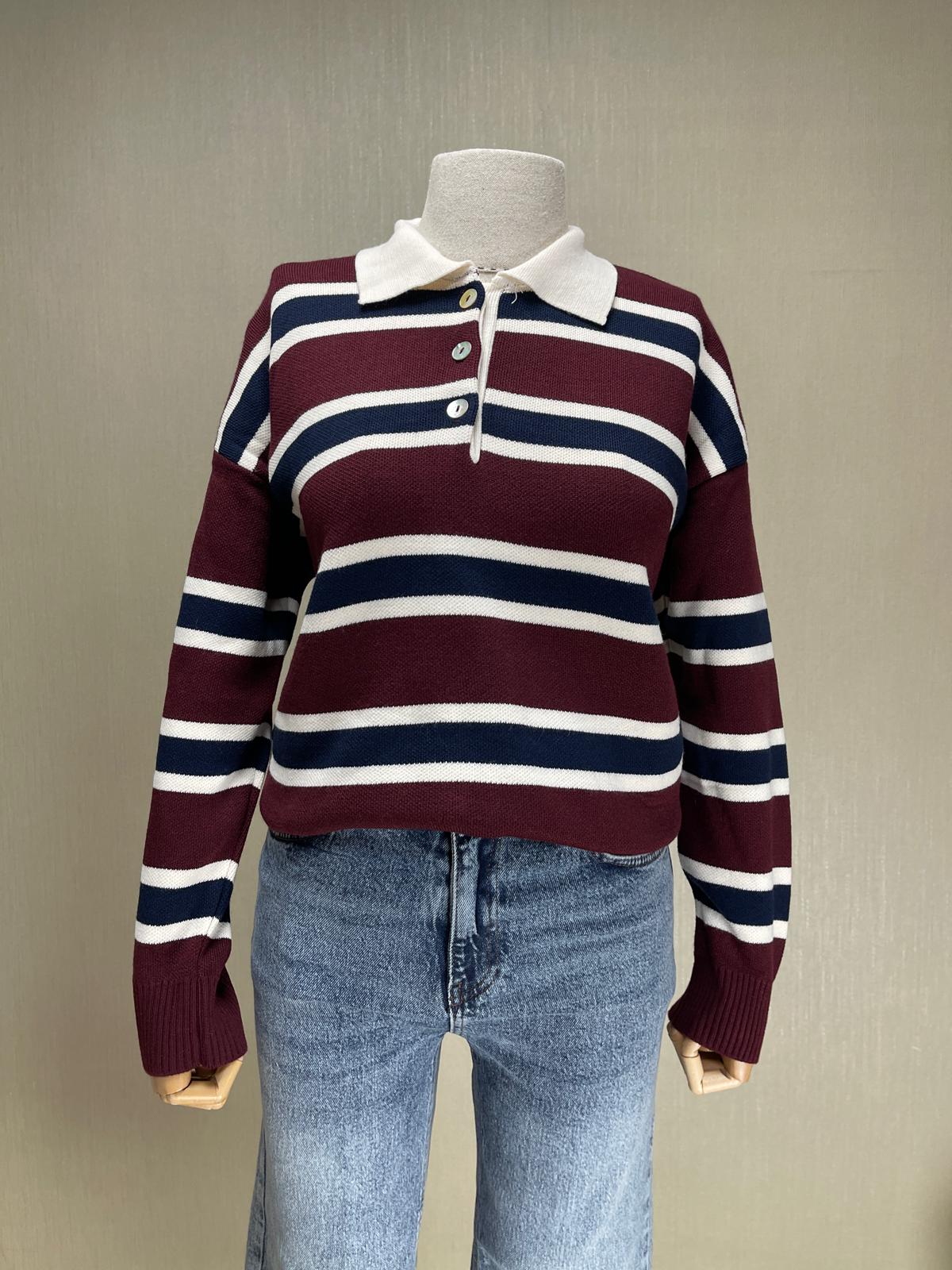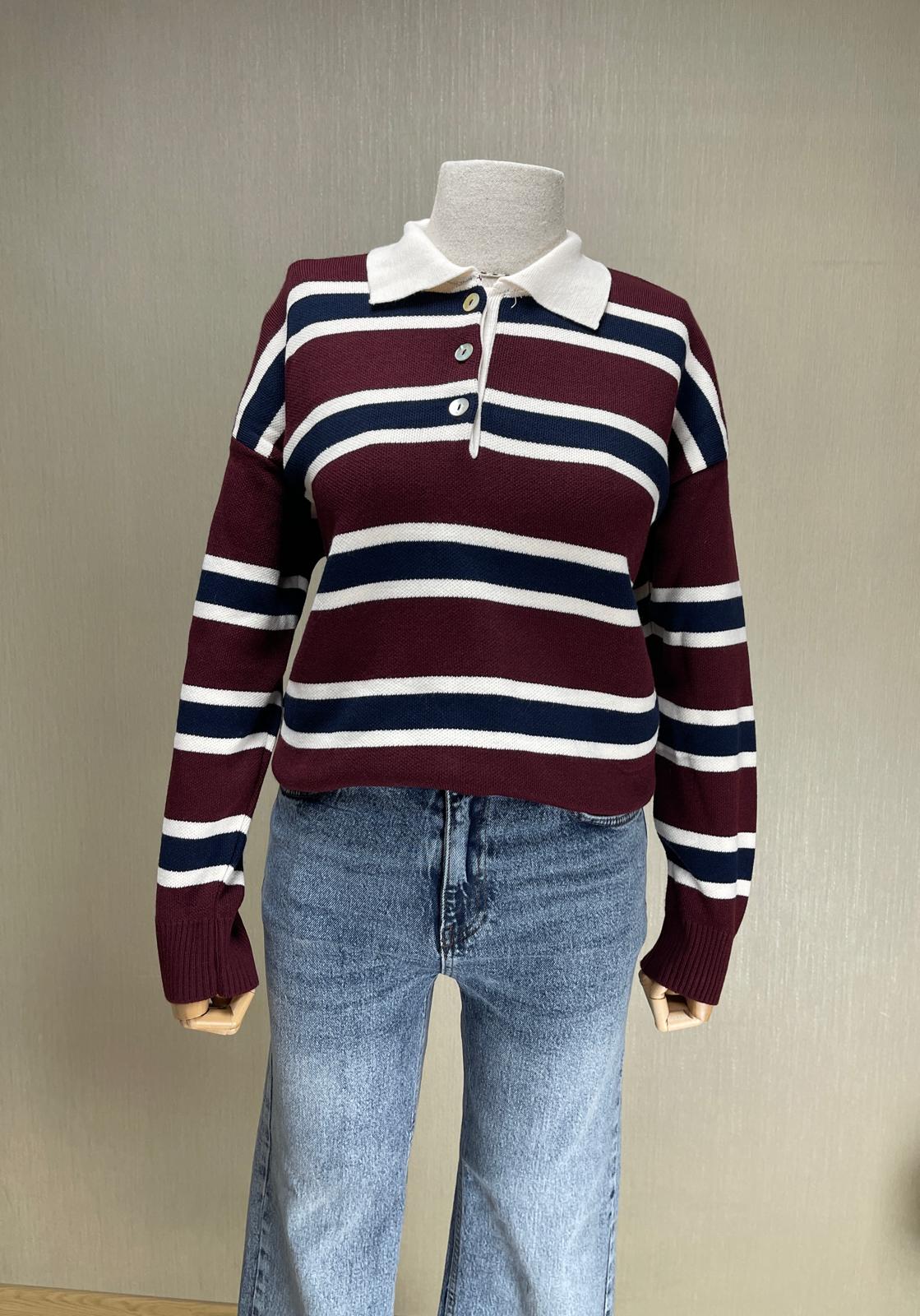 Retro tarzda çizgili polo yaka triko kazak. Bordo ve lacivert zemin üzerine beyaz şeritler, üç düğmeli polo yaka tasarımı ile modern görünüm.