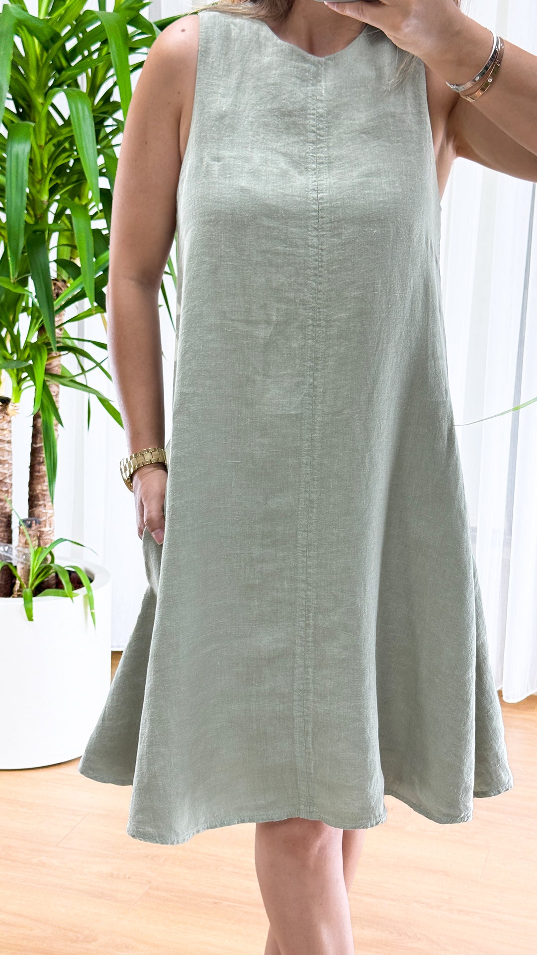 Doğal Zarafet: Haki Keten Kolsuz Elbise | Earth Tone Şıklığının Temsilcisi
