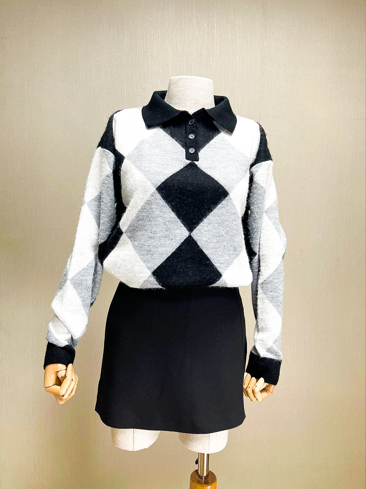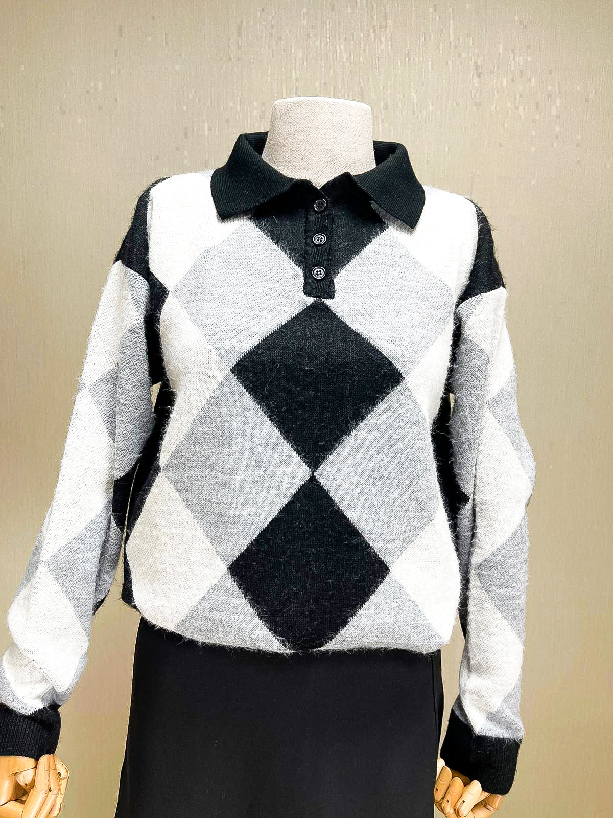 Modern ekose deseniyle dikkat çeken polo yaka triko kazak. Siyah, beyaz ve gri renk kombinasyonuyla şık bir görünüm sunar. Üç düğmeli polo yaka detayı ve klasik ekose örme deseni ile retro tarzı yansıtır.