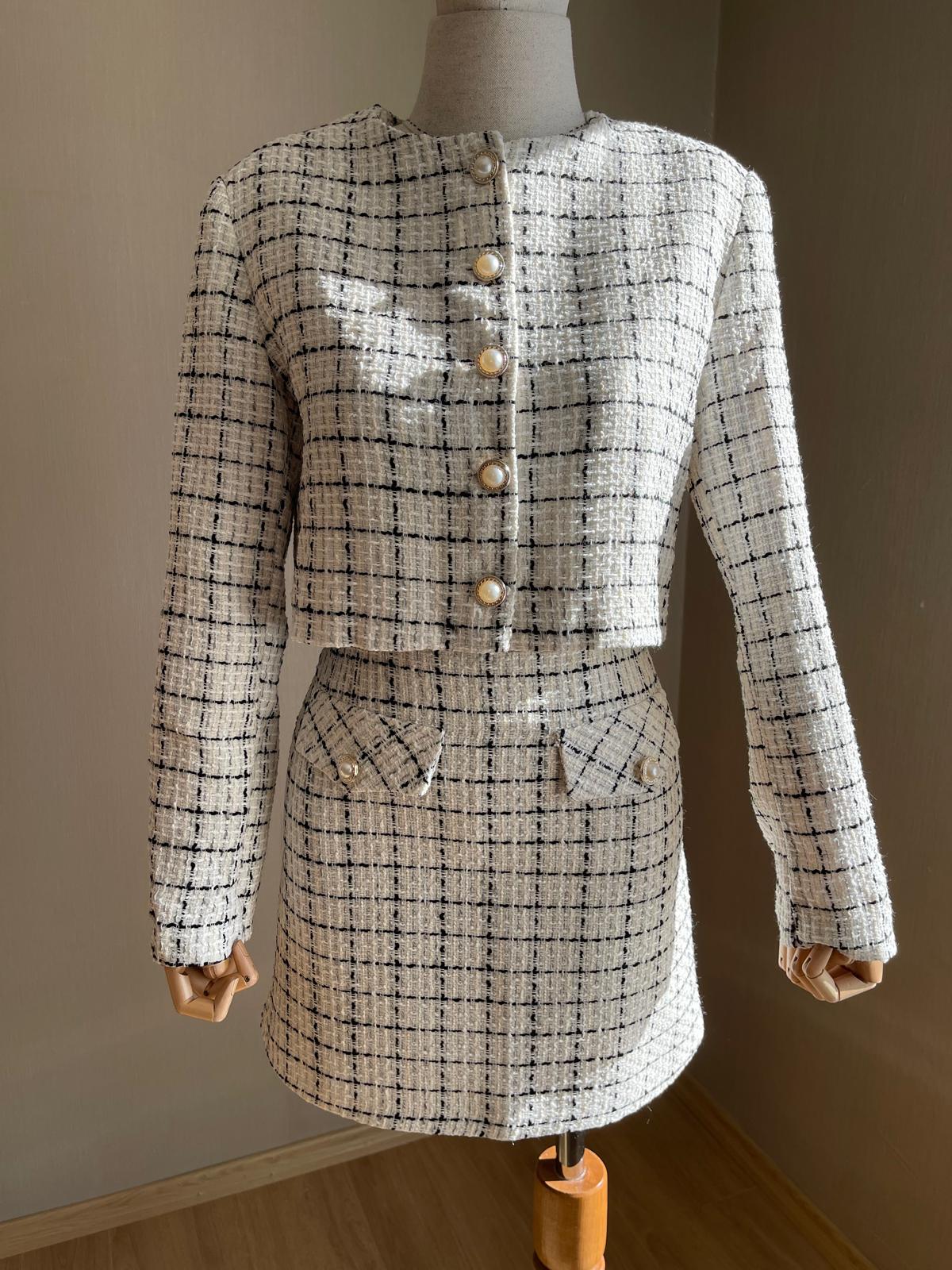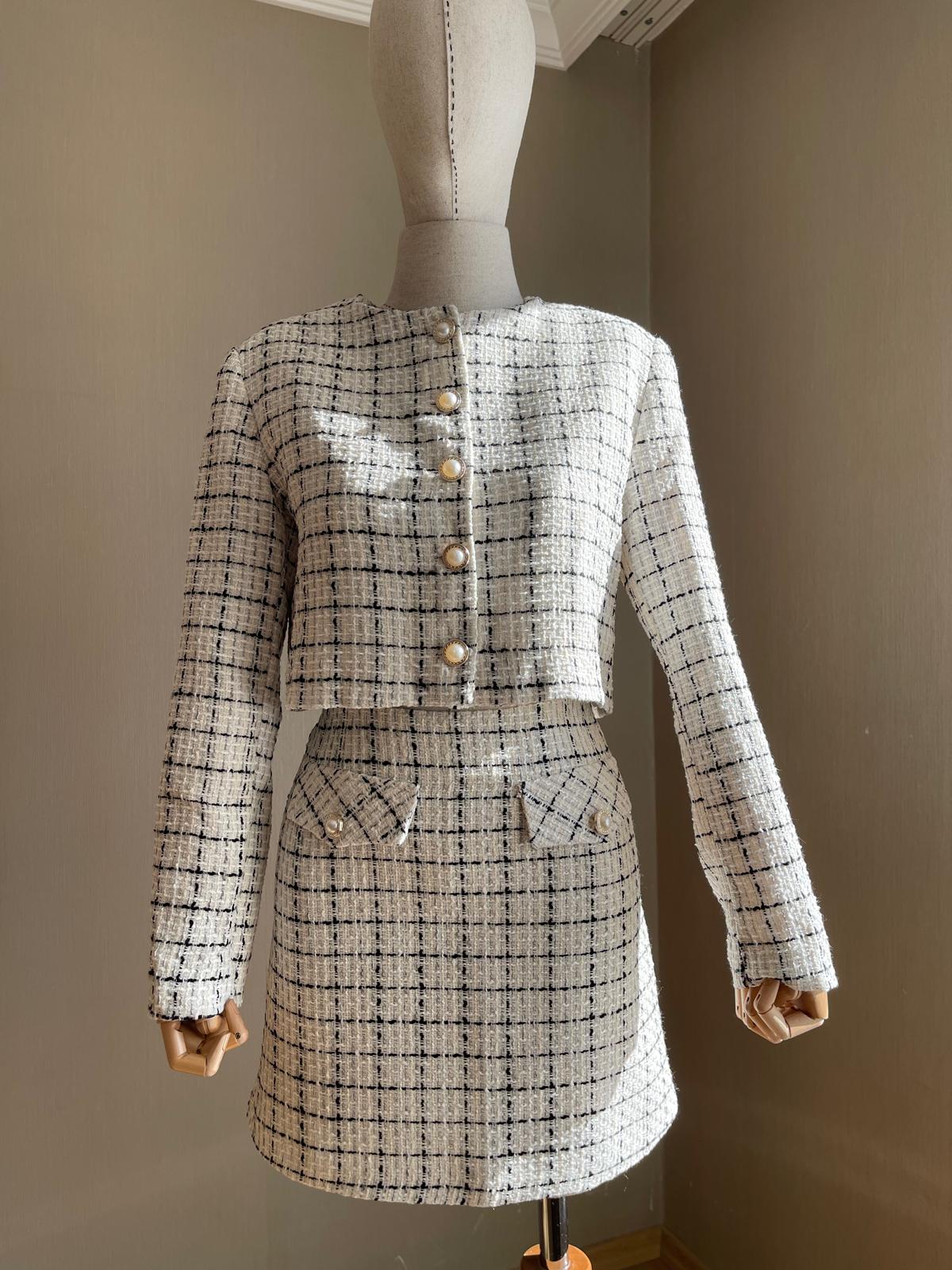 Ekru-Siyah Çizgili İnci Düğmeli Tüvit Premium parçamız, Fransız şıklığını modern bir yorumla sunarken, her ortamda sizi öne çıkaracak. Kaliteli malzemesi ve özenli dikimi sayesinde uzun yıllar gardırobunuzun gözdesi olacak.