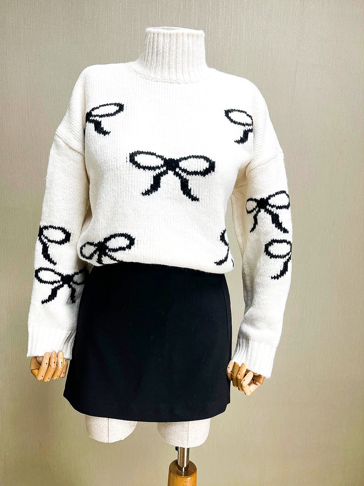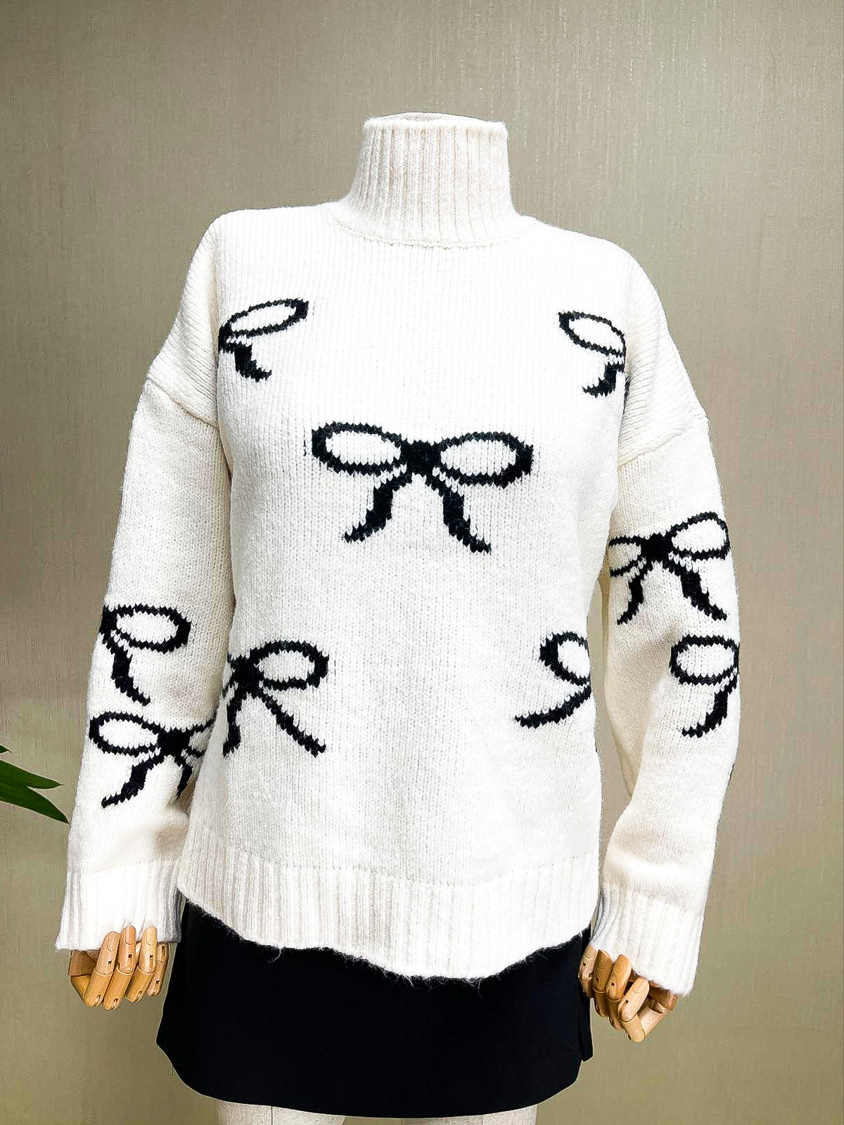 Sevimli fiyonk desenleriyle süslenmiş, yumuşak dokulu beyaz boğazlı triko kazak. Modern tasarımı ve rahat kalıbıyla günlük şıklık sunar. Balıkçı yaka detayı, uzun kolları ve oversized kesimi ile dikkat çeken model, kış sezonunun vazgeçilmezi.