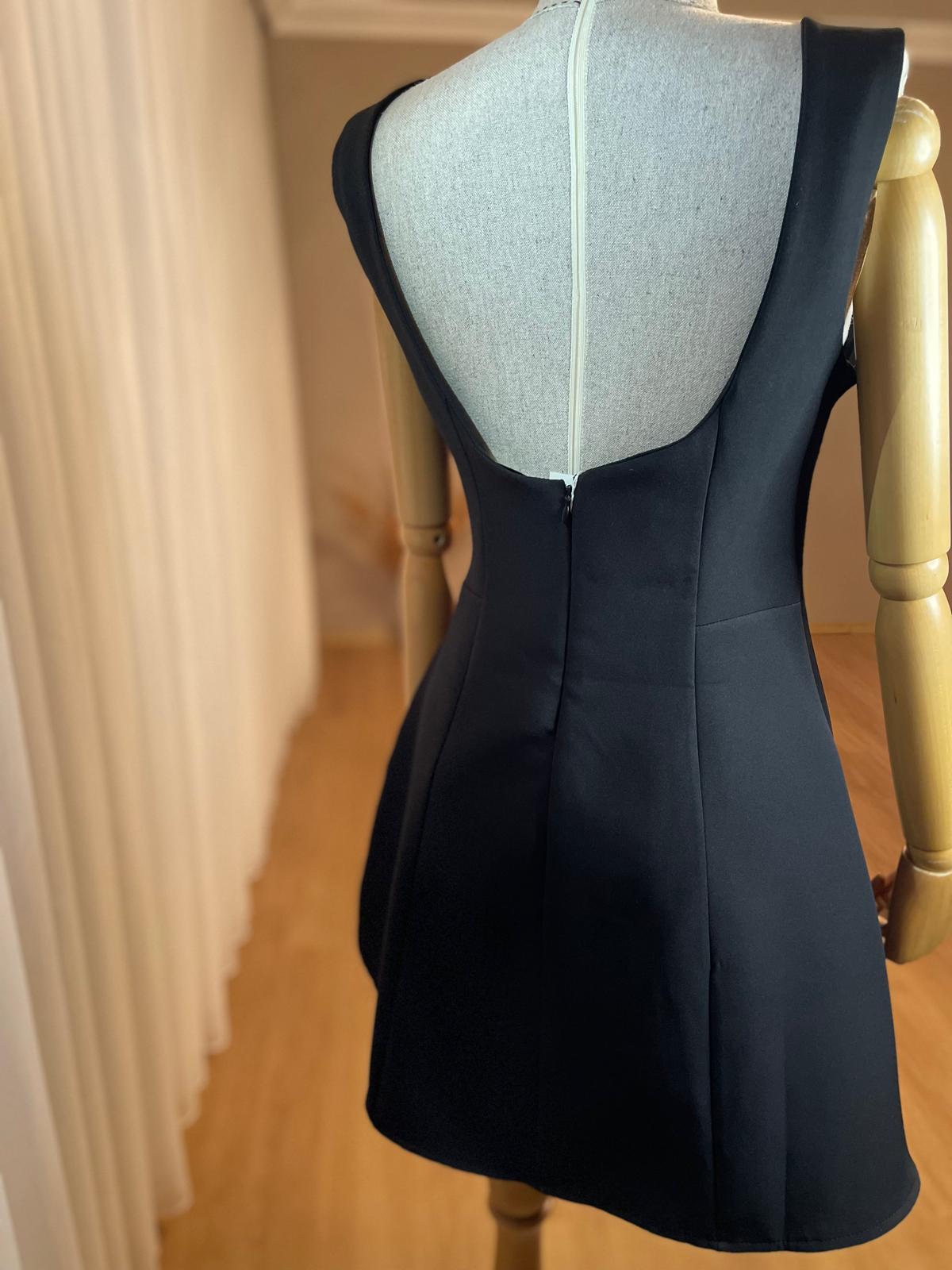Özel davetlerden romantik akşam yemeklerine kadar pek çok organizasyonda tercih edebileceğiniz bu elbise, siyahın zamansız şıklığını modern detaylarla buluşturuyor. İnce askıları ve derin sırt dekoltesi ile feminen bir görünüm yakalarken, diz üstü boyu ile dengeli bir şıklık sunuyor.