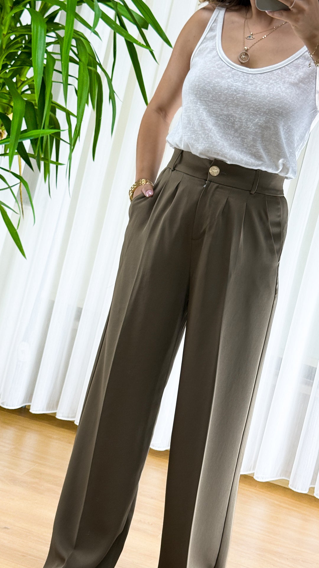 Haki renginin earth tone derinliğini pileli detayların structured tasarımıyla buluşturan palazzo pantolonumuz, yüksek bel kesimi ve relaxed siluetiyle natural sophistication sunuyor! Military inspired rengin civilian chic versiyonu ile modern gardırobun versatile parçası.