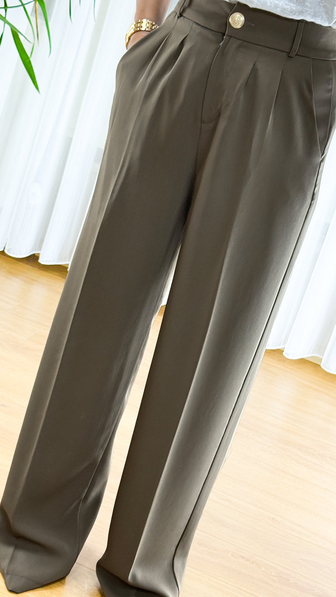 Bel kısmındaki clean pileler pantolona tailored bir görünüm kazandırırken, wide leg kesimin comfortable flow'u casual elegance yaratıyor. Altın rengi düğme detayı ve haki tonunun muted richness'ı, utility wear'ın refined interpretation'ını sergiliyor.