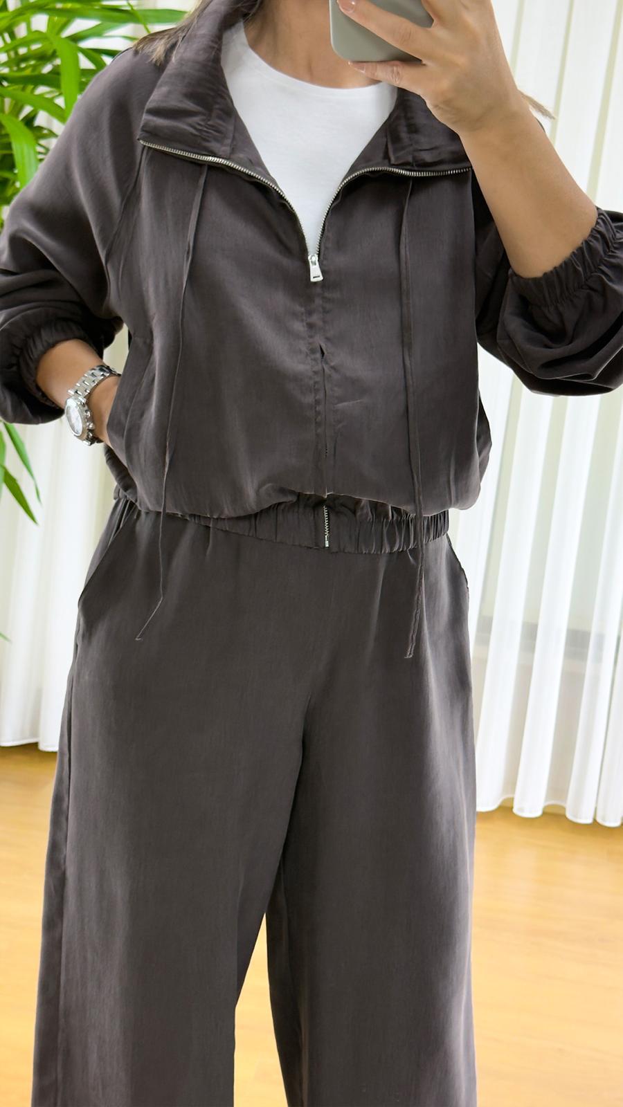 İkili takım, fermuarlı bomber ceket ve beli lastikli rahat pantolon olmak üzere iki parçadan oluşuyor. Bomber ceketinin dik yaka detayı ve fermuar kapama sistemi, sportif bir hava katarken pratik kullanım sağlıyor. Bel ve bilek kısımlarındaki lastik detaylar, modern bir silüet oluştururken konfor sunuyor.