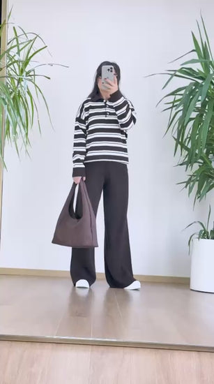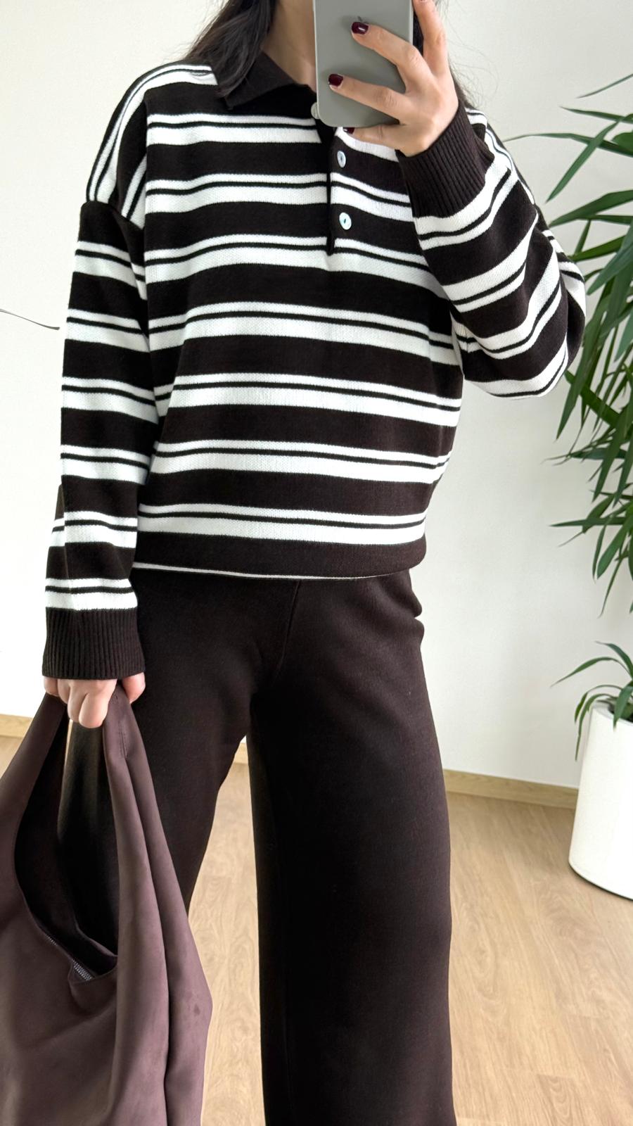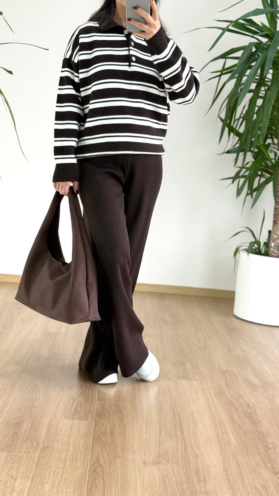 Konfor ve stilin mükemmel buluşması olan kahverengi çizgili triko takım ile hem rahat hem de doğal görünün. Preppy tarzın modern yorumu olan bu özel ikili set, polo yaka kazak ve geniş paça pantolon kombinasyonuyla kış aylarının en sıcak ve trend parçası.