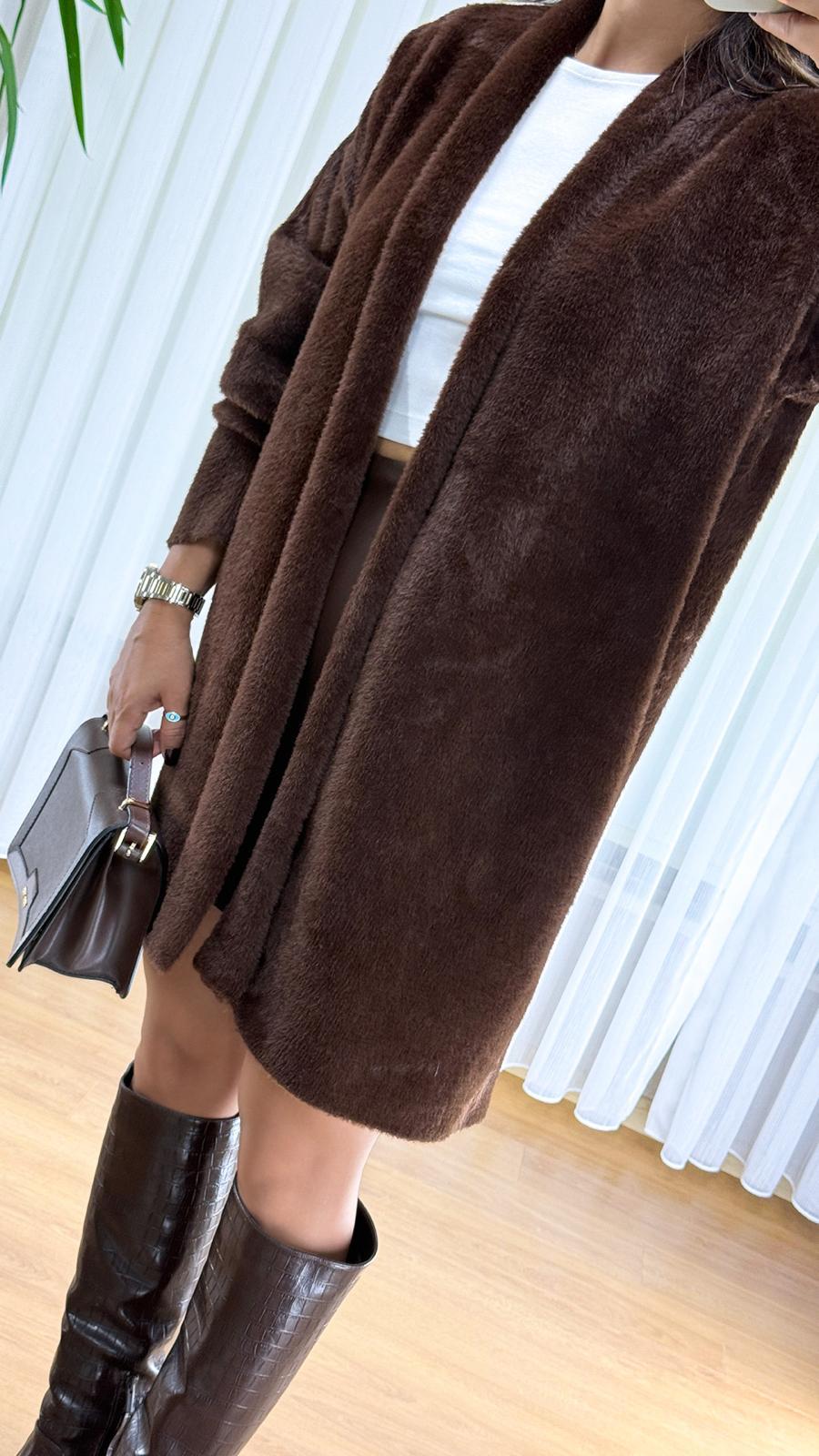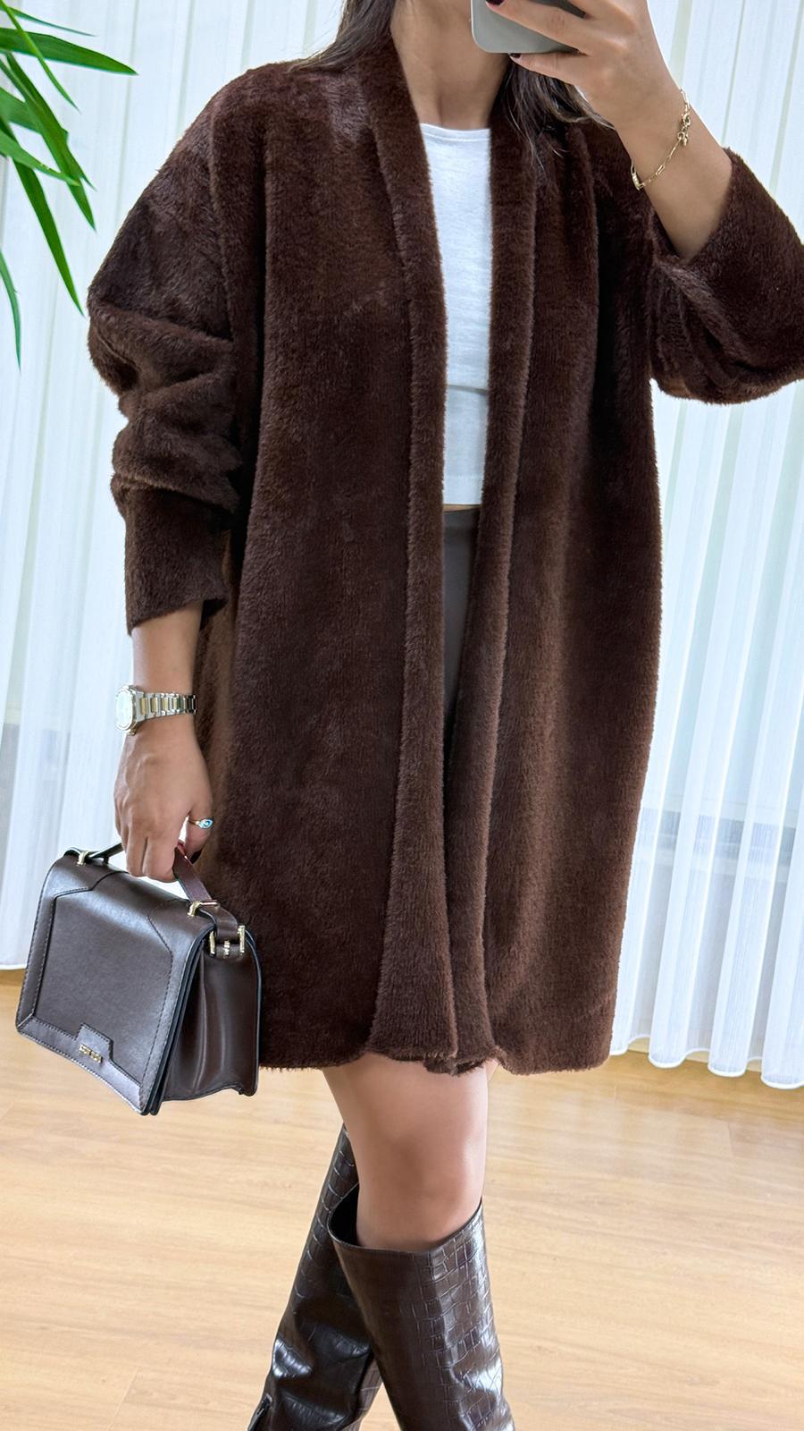 Kış aylarının en sıcak ve şık yoldaşı olan bu sakallı hırka ile hem konfordan hem de stilden ödün vermeyin. Bulut yumuşaklığındaki dokusu ve zarif kahverengi tonu ile gardırobunuzun vazgeçilmezi olacak!