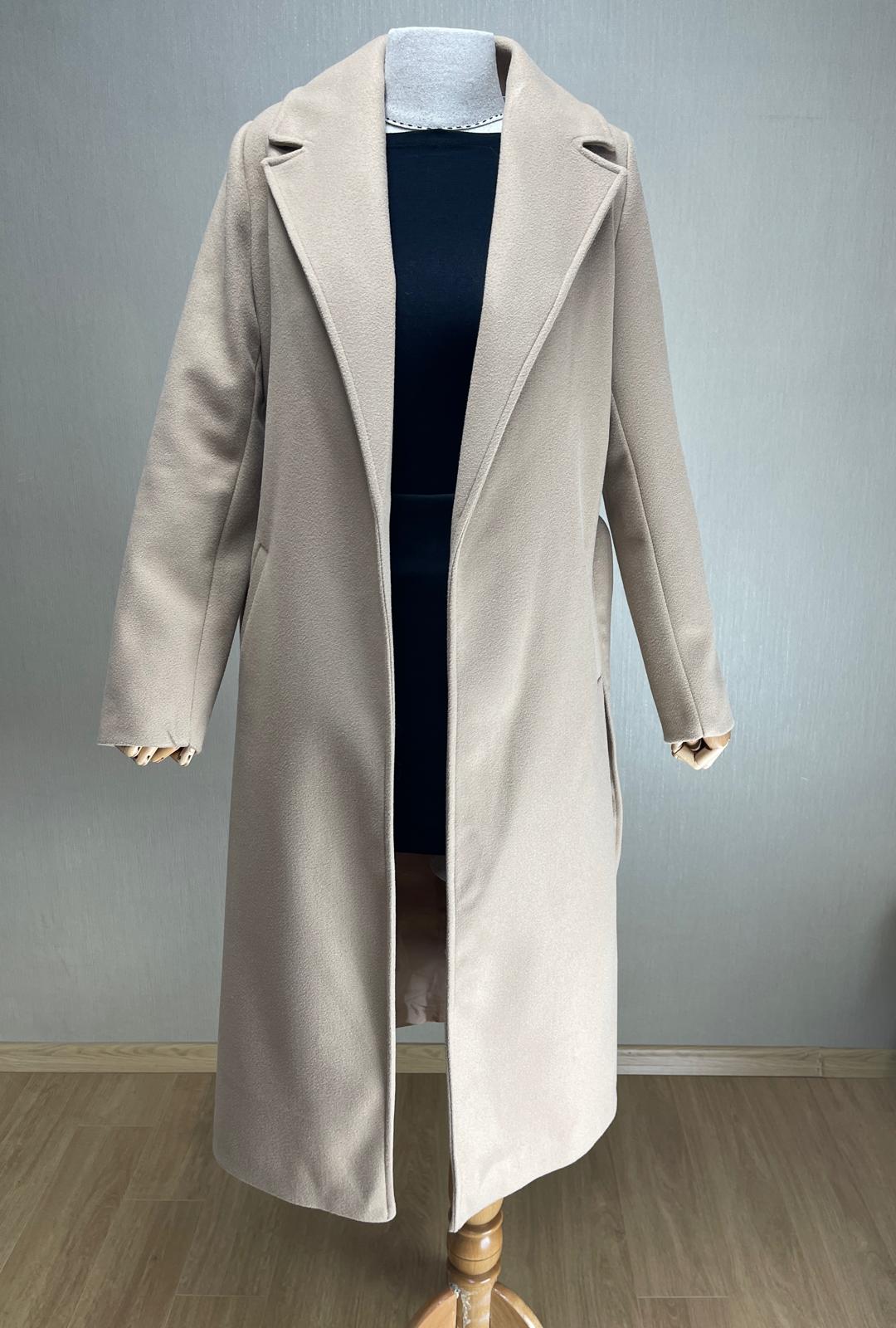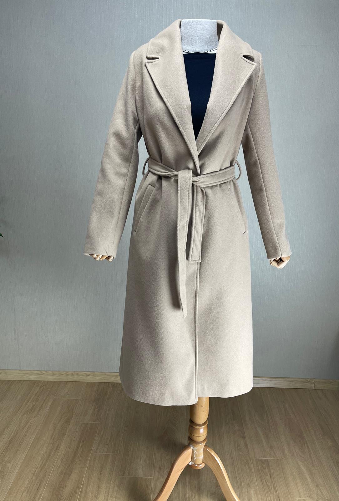 Modern tasarımlı bej kaşe kaban, kemerli ve uzun model.