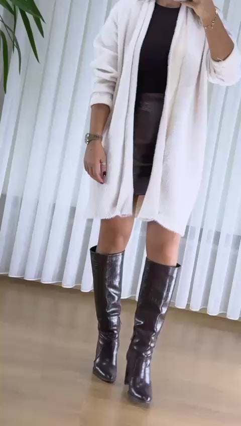 Krem beyaz tonu, her kombine kolayca uyum sağlayan zamansız bir renk. Bu özel hırka, uzun boy kesimiyle hem zarif hem de çok yönlü bir kullanım sunuyor. Sakallı peluş doku, ekstra sıcaklık sağlarken görsel olarak da zengin bir his veriyor.