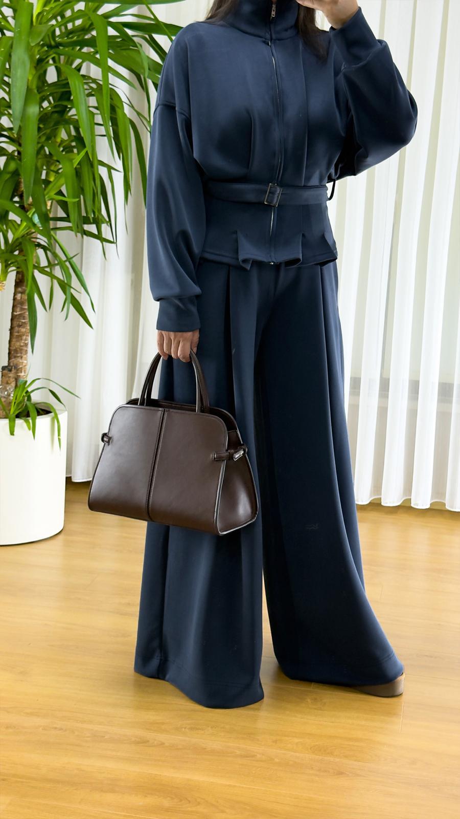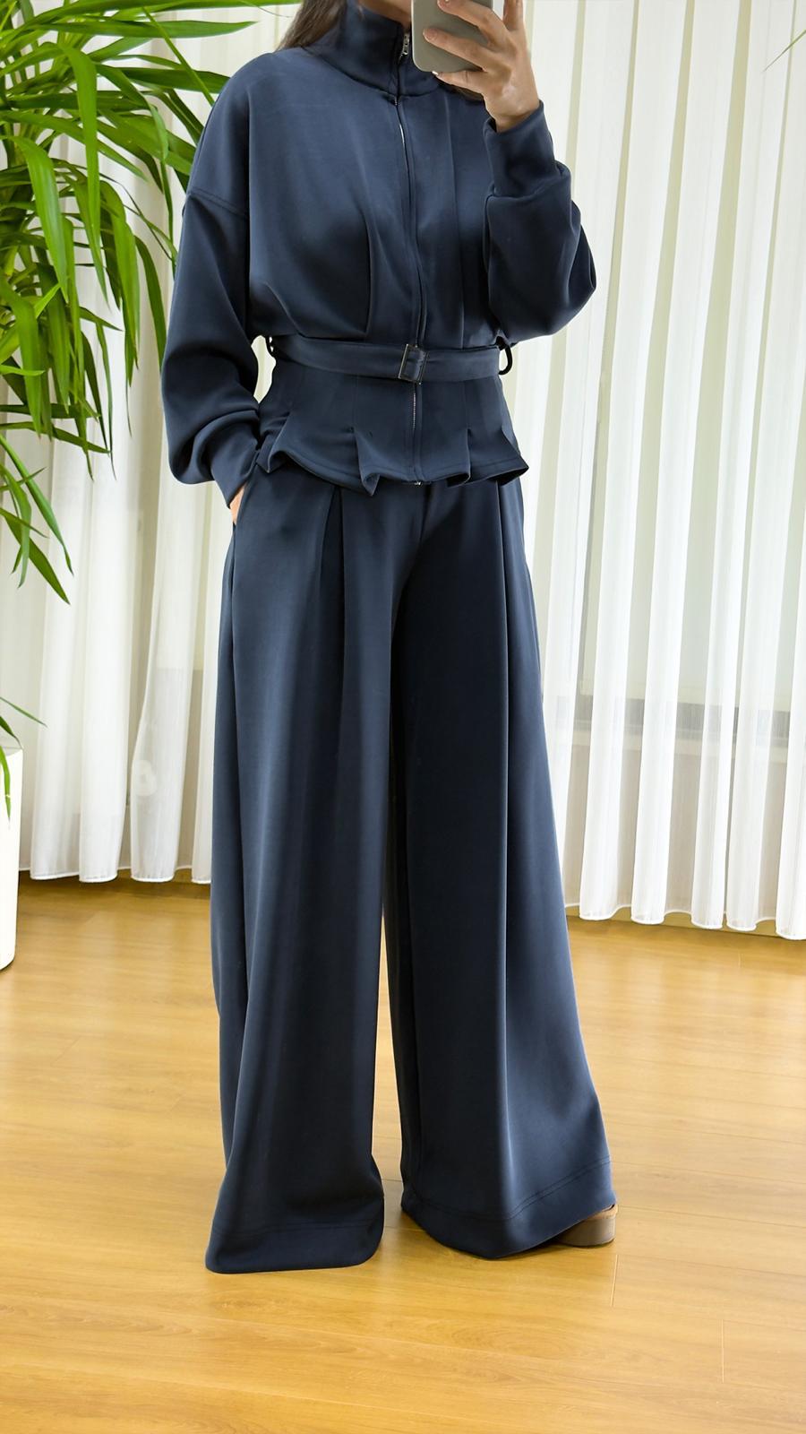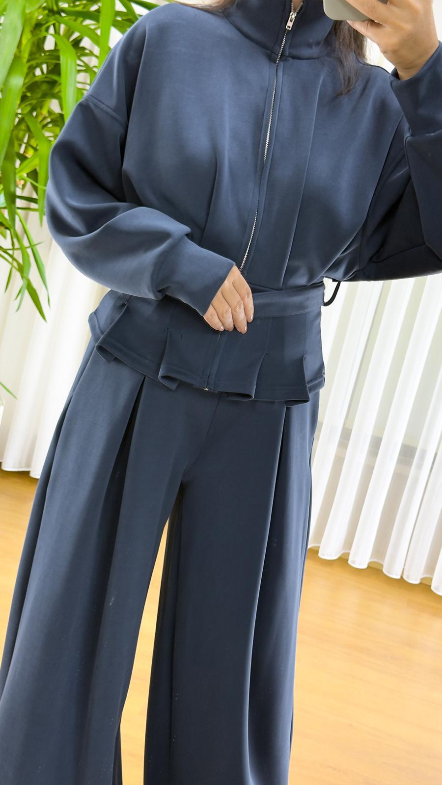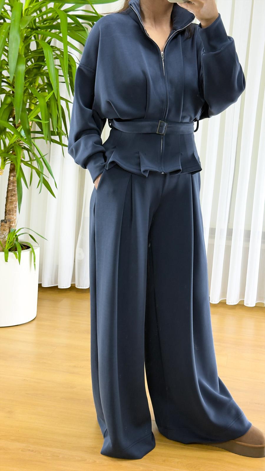 İkili takım, fermuarlı sweatshirt ve beli büzgülü rahat pantolon olmak üzere iki parçadan oluşuyor. Sweatshirt üzerindeki bel detayı ve fermuar kapama, modern bir görünüm katarken pratik kullanım sağlıyor. Pantolon bol kesim ve geniş paçasıyla rahat hareket imkanı sunuyor.