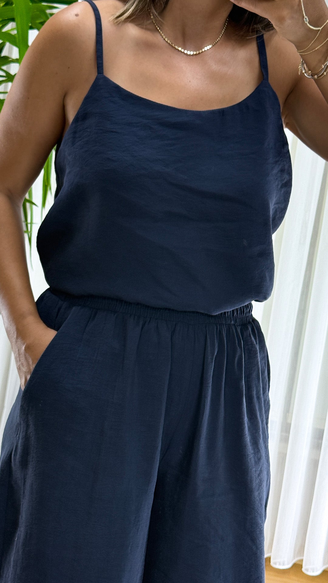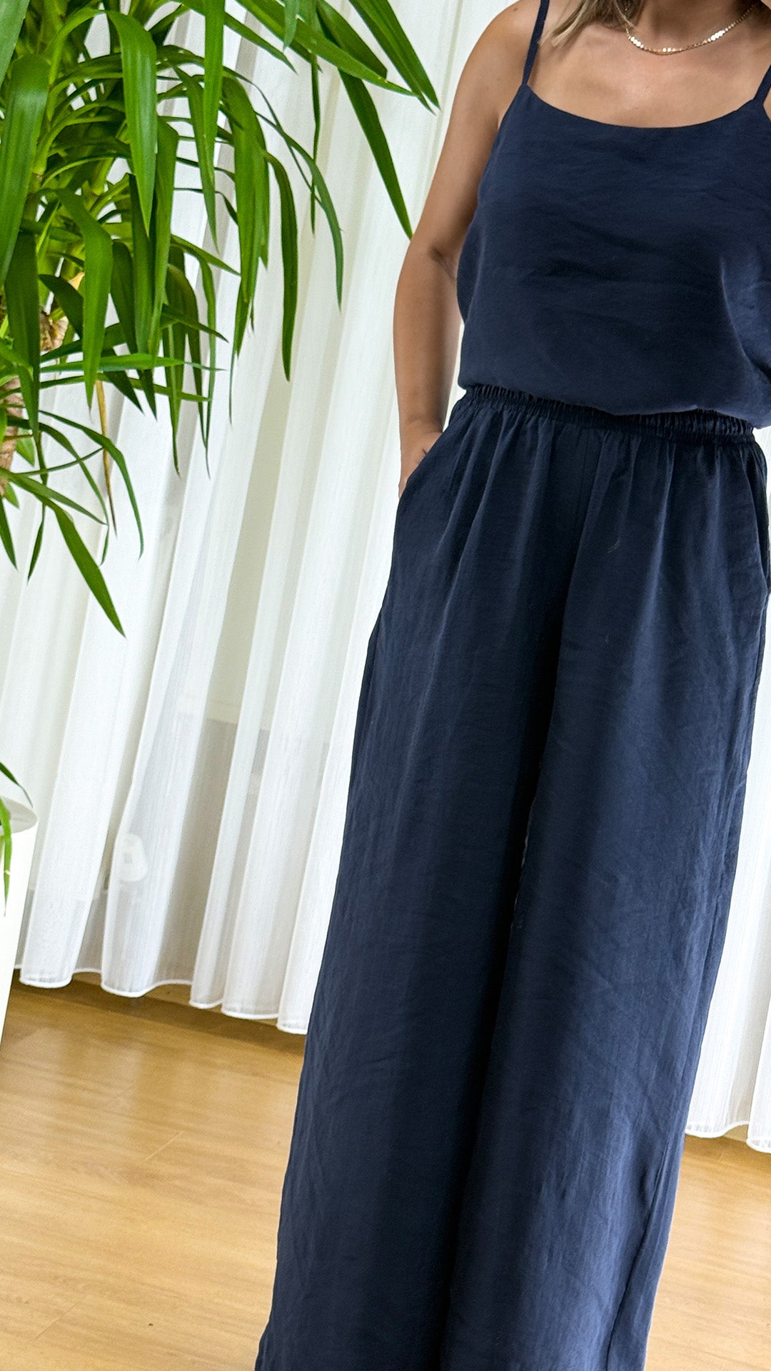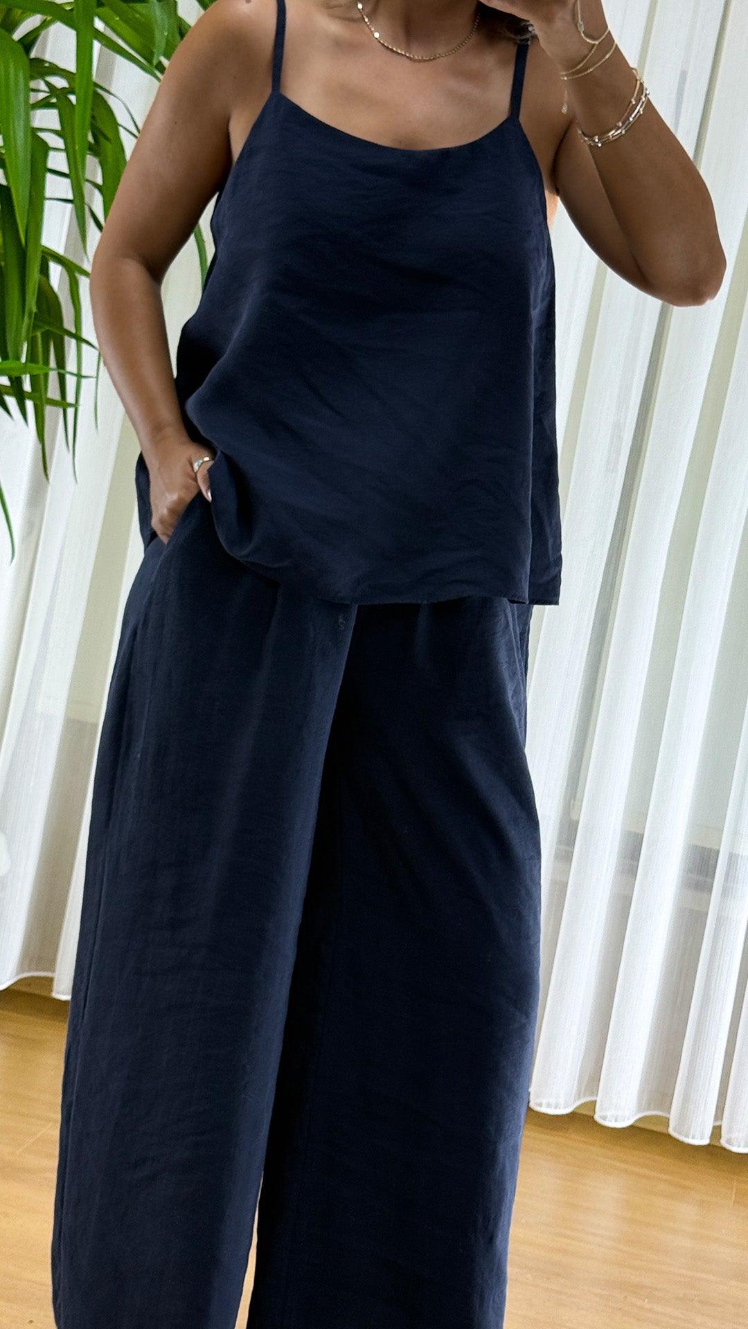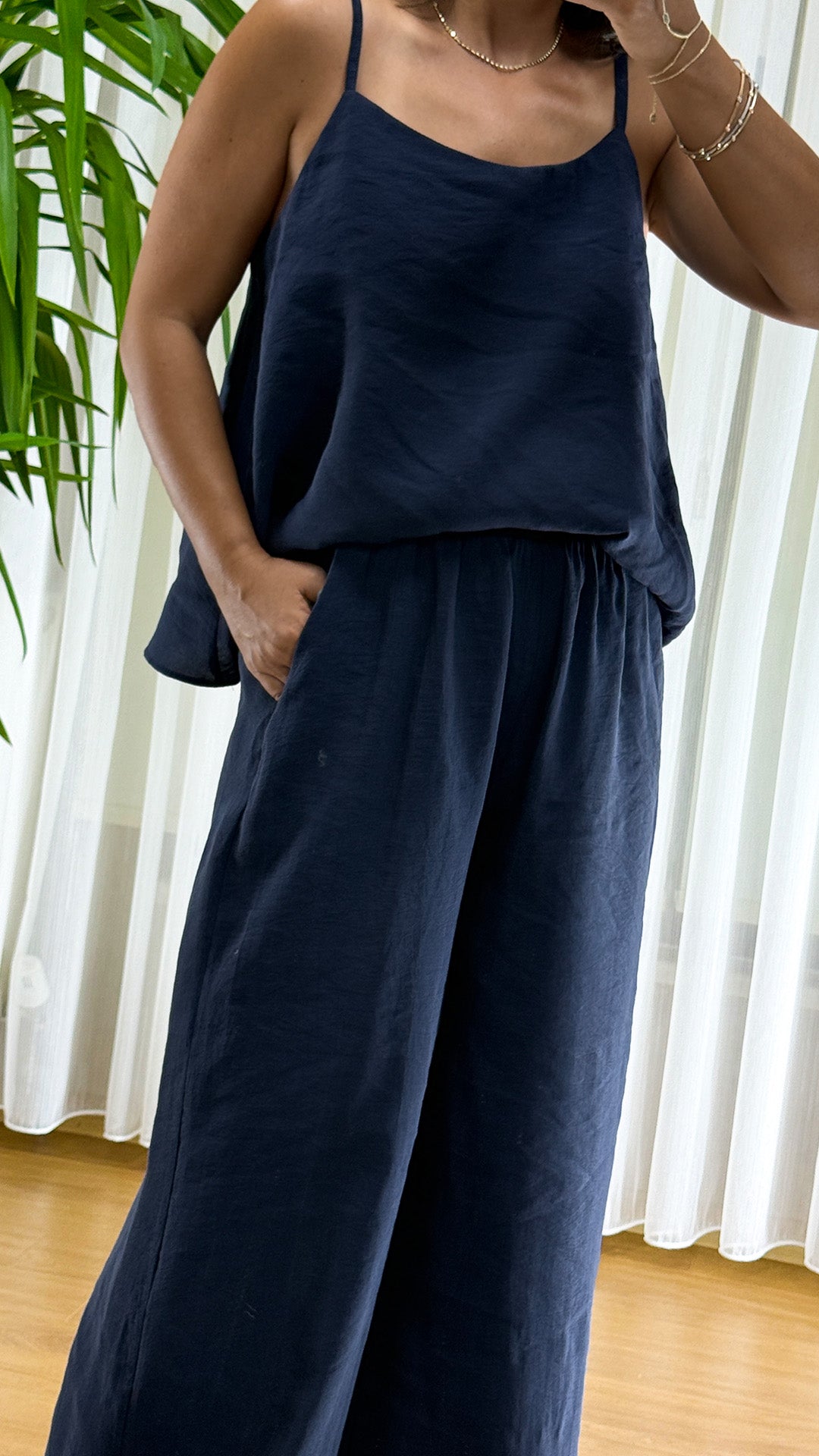 İnce askılı üst, yumuşak düşüşü ile zarif bir görünüm yaratırken, lastik belli palazzo pantolon maksimum hareket özgürlüğü sağlıyor. Tensel kumaşın doğal parlaklığı ve laciverin sophisticated derinliği, zahmetsiz şıklığın ideal temsilcisi olarak öne çıkıyor.
