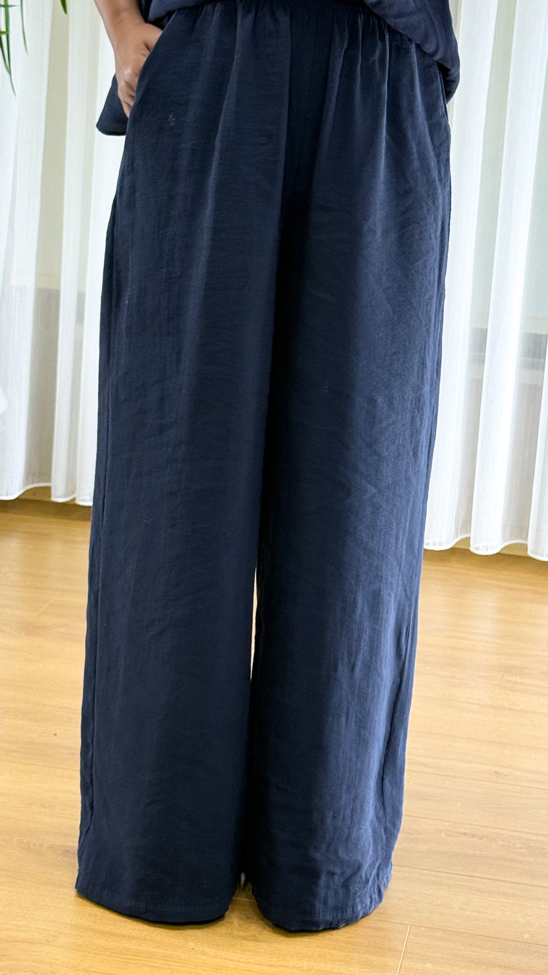 Laciverin asil tonlarını tensel kumaşın yumuşak dokusunda buluşturan takımımız, askılı üst ve bol paça pantolon kombinasyonuyla günlük şıklığın mükemmel örneğini sunuyor! Nefes alabilir kumaş yapısı ve rahat kesimi ile hem konforlu hem şık bir deneyim vadediyor.