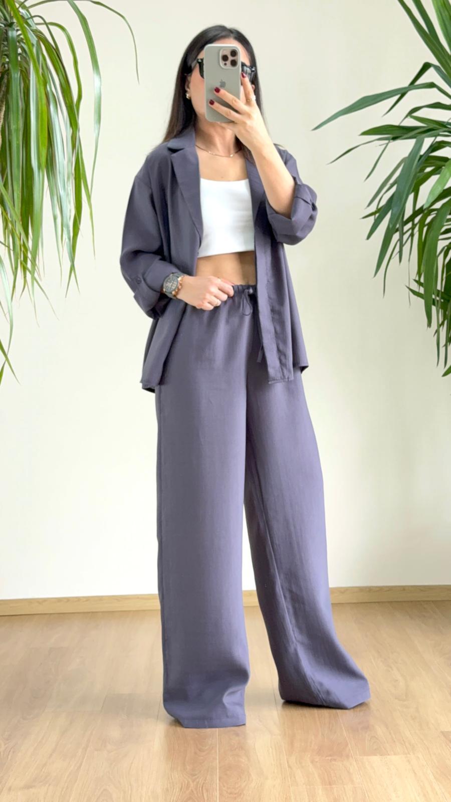 Üst parçada yer alan rahat kesimli ceket formu, klasik kalıpların dışına çıkarak daha özgür ve modern bir silüet oluşturur. Açık kullanıma uygun yapısı sayesinde farklı parçalarla kombinlenebilir ve her defasında yeni bir stil yaratmanıza olanak tanır. İçine tercih edilecek minimal bir crop top ya da basic parça ile birlikte kullanıldığında, sade ama etkileyici bir görünüm elde edilir. Bu katmanlı stil yaklaşımı, günümüz moda anlayışının en güçlü yansımalarından biridir.