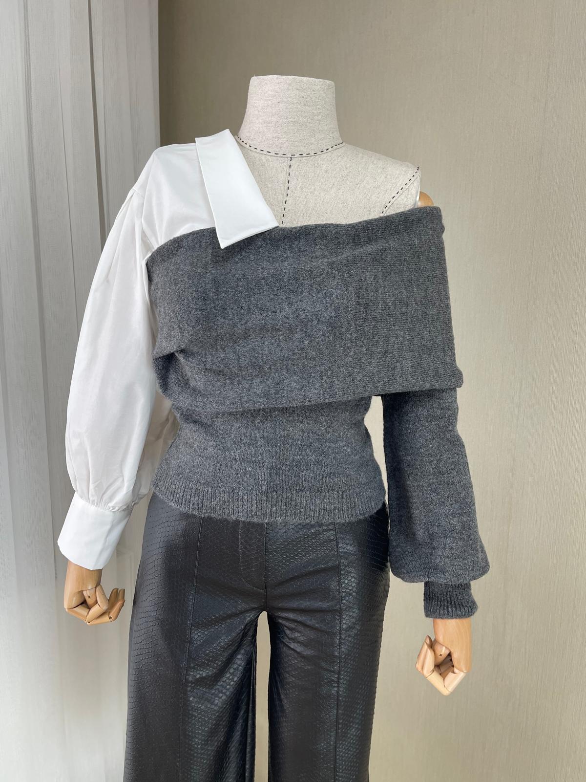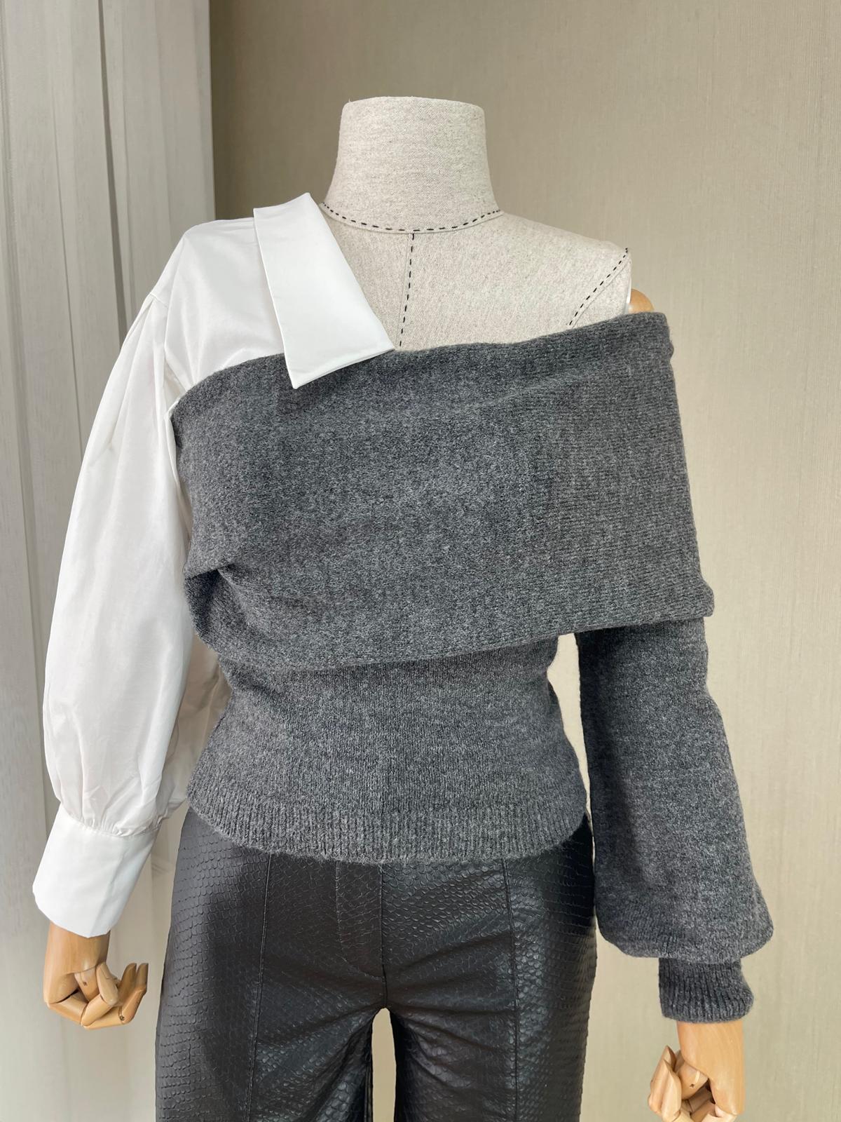 Klasik gömlek ve triko kazağın yenilikçi bir yorumla buluştuğu bu özel parça, modern gardıropların yeni gözdesi olmaya aday! Gri triko ve beyaz gömlek detayının asimetrik uyumuyla dikkat çeken bu tasarım, ofisten özel davetlere kadar her ortamda sizi şık gösterecek.
