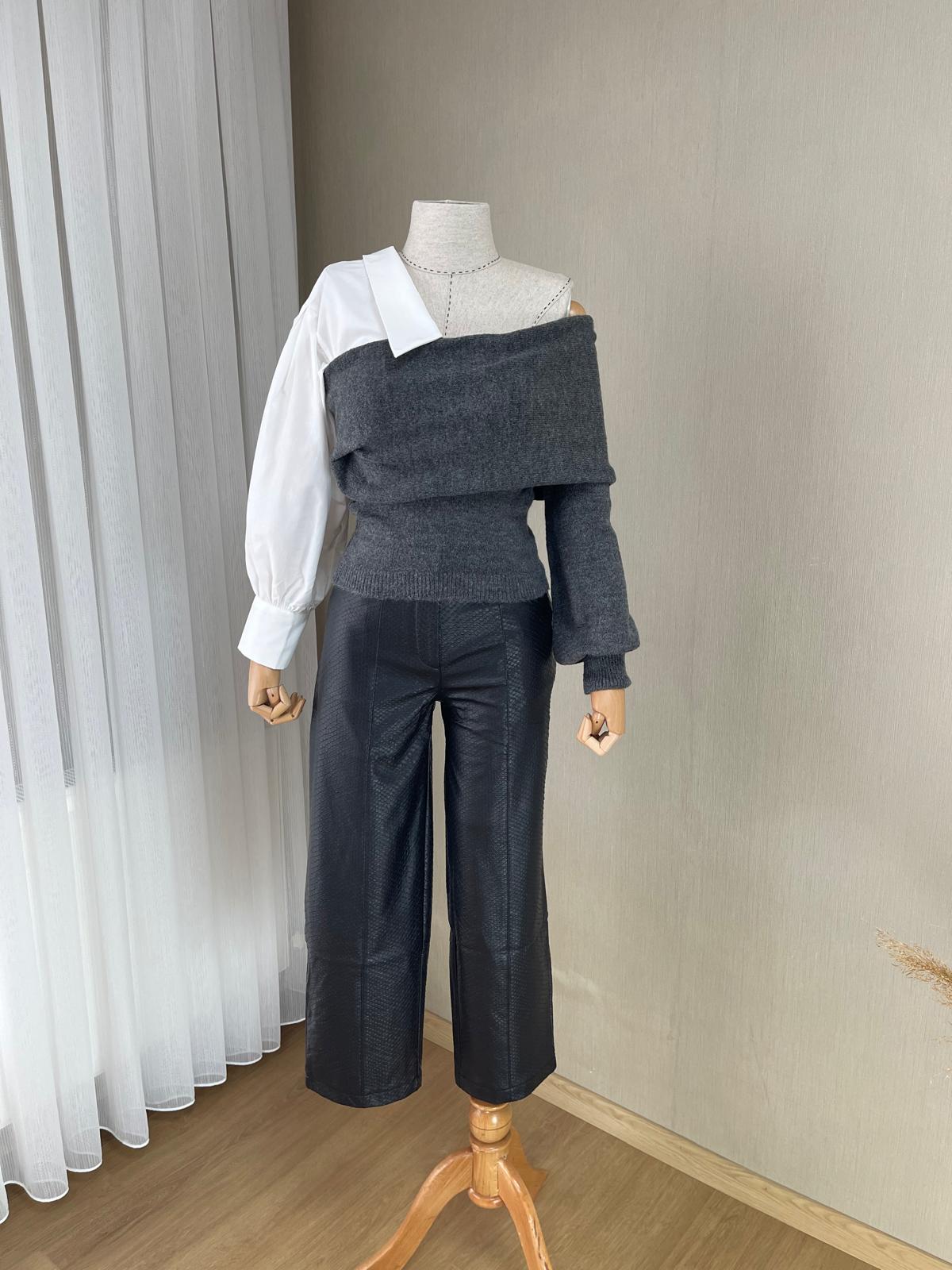Üst kısmında tek omuzda geniş bir bantla tasarlanan gri triko kısmı, alt belde daralan kesimi ile feminen bir siluet yaratıyor. Diğer omuzda görünen beyaz gömlek yakası ve uzun manşetli kol detayı, parçaya sofistike bir hava katıyor. Vücudu saran kesimi ve balon kol tasarımıyla modern bir görünüm sunuyor.