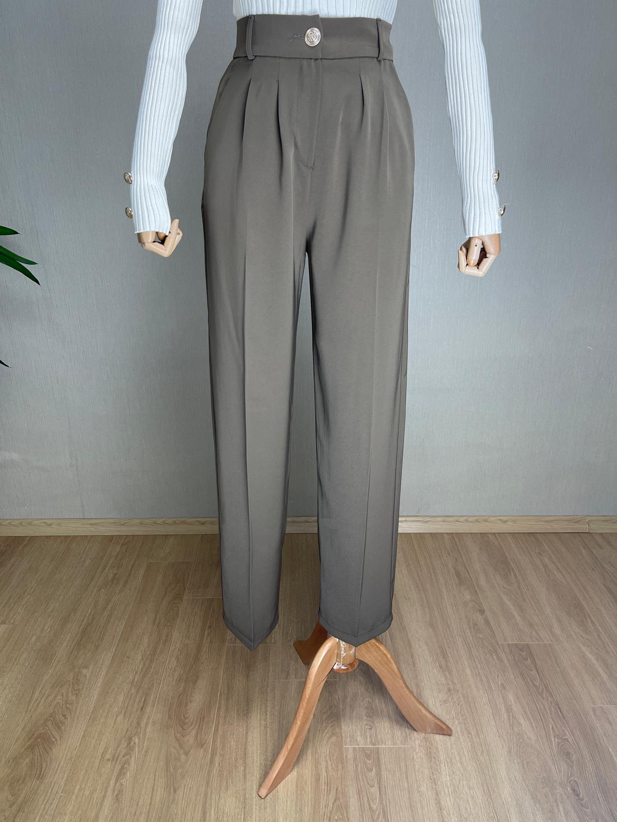 Yüksek bel kesimindeki pileler ve minimal gümüş düğme detayıyla sofistike bir görünüm sunan bu pantolon, düz paça tasarımıyla klasik bir siluet yaratıyor. Haki rengin soft tonu, her tarza uyum sağlayan versatil bir kullanım vadediyor.