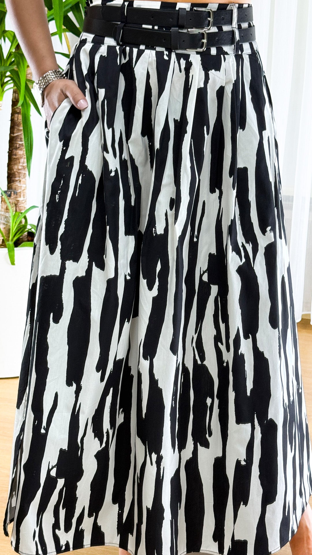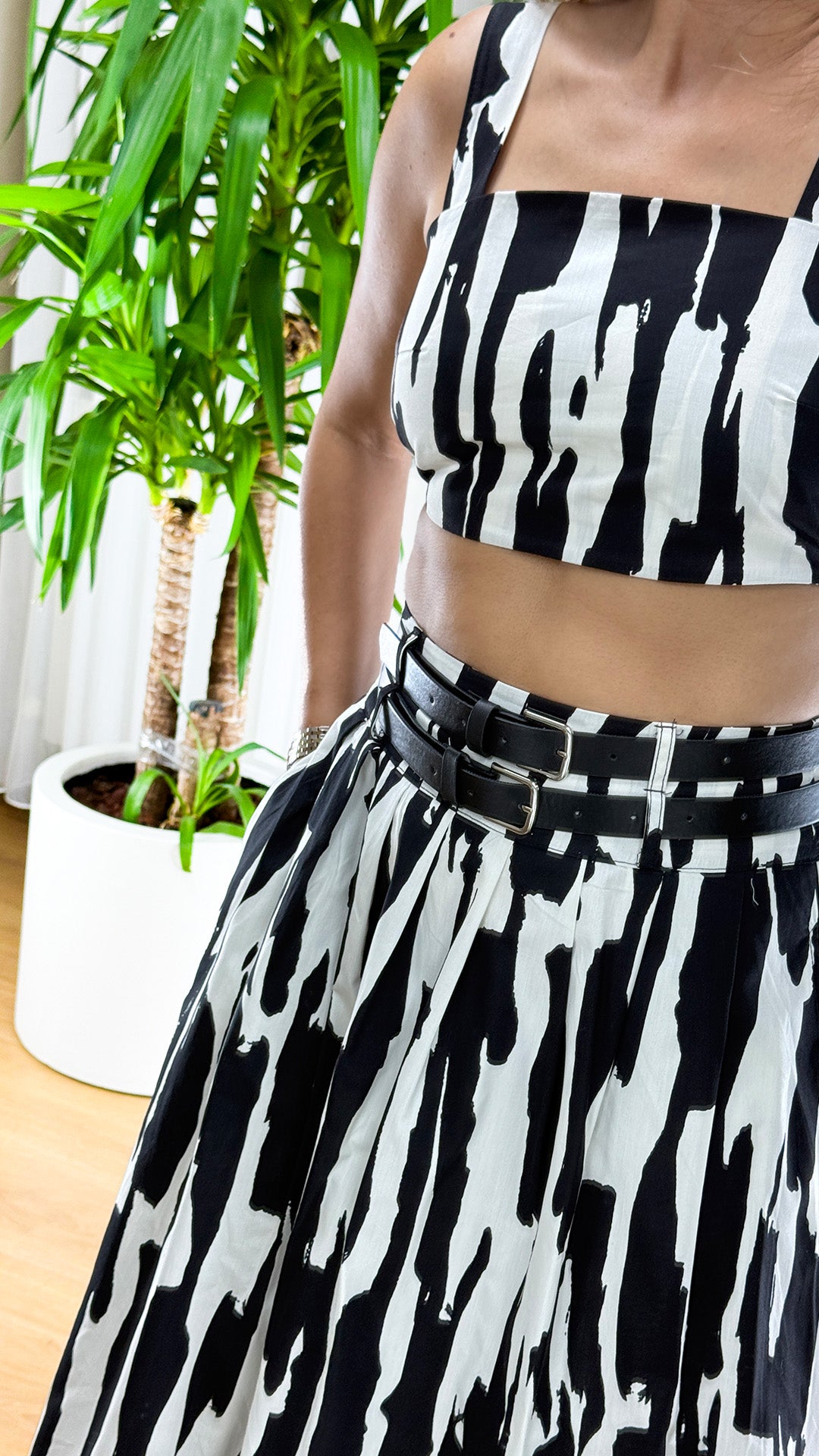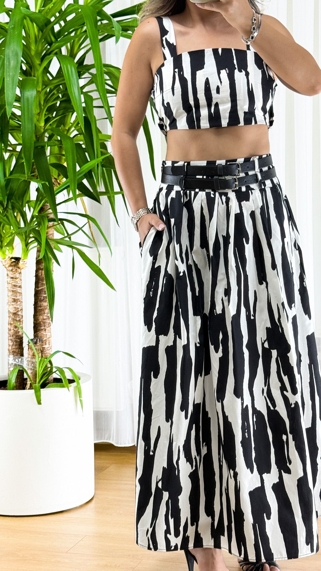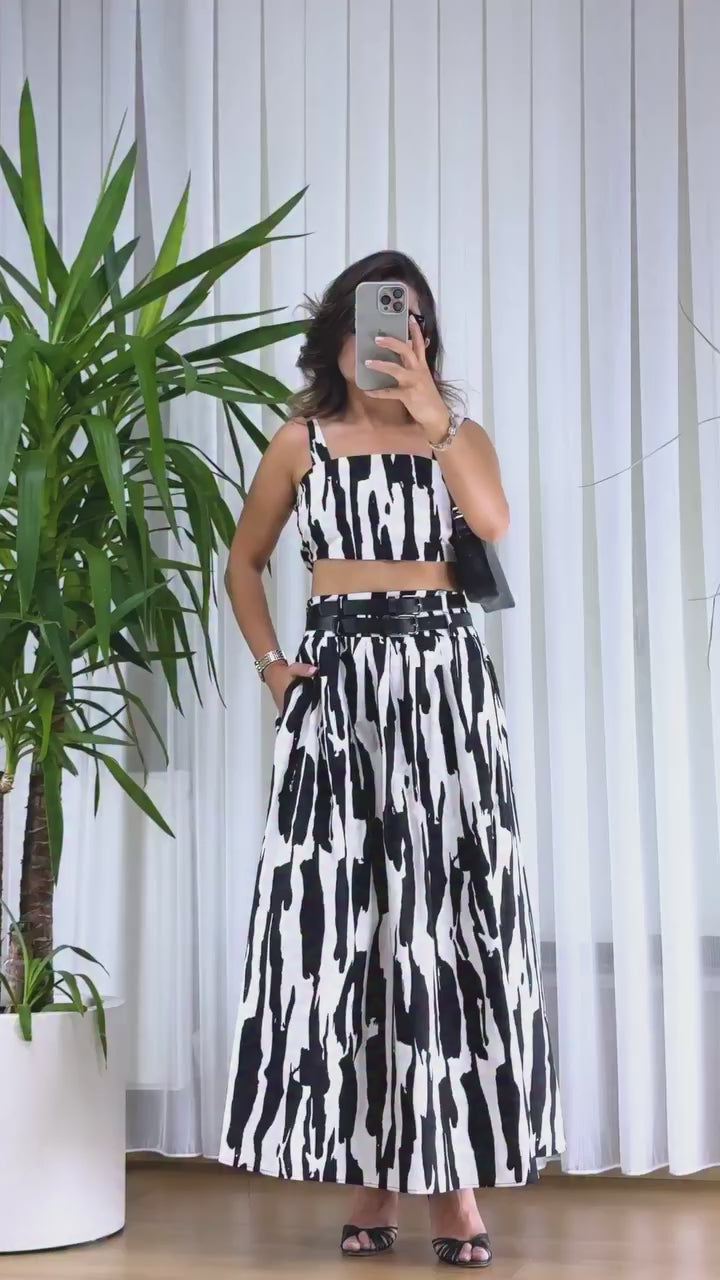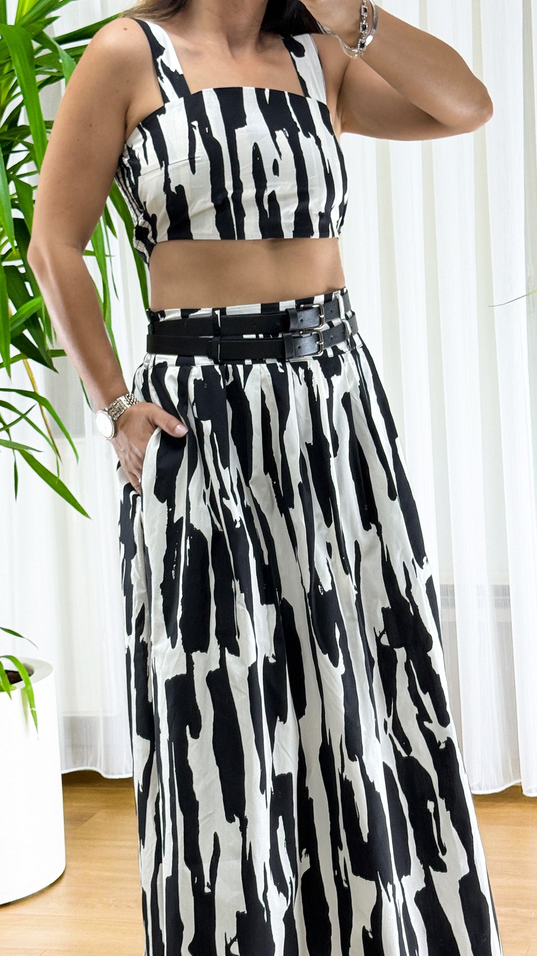 Sanatsal çizgileri modern bir takımla buluşturan siyah beyaz desenli setimiz, crop üst ve bol paça pantolon kombinasyonuyla göz alıcı bir görünüm vadediyor! Abstract desenin dinamik enerjisi ve iki parçalı kesim, sezonun en trend stillerinden birini yaratıyor.