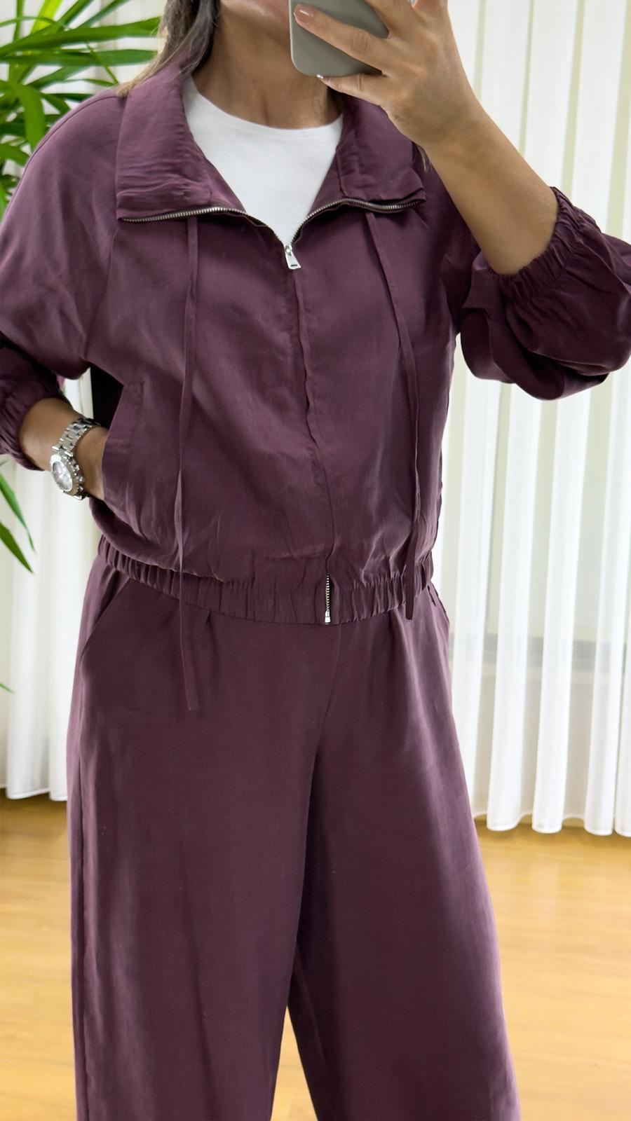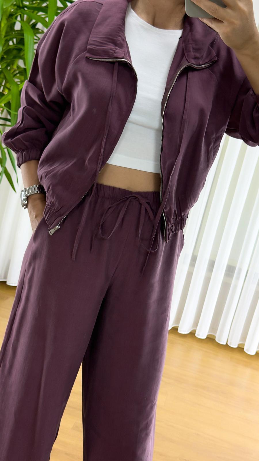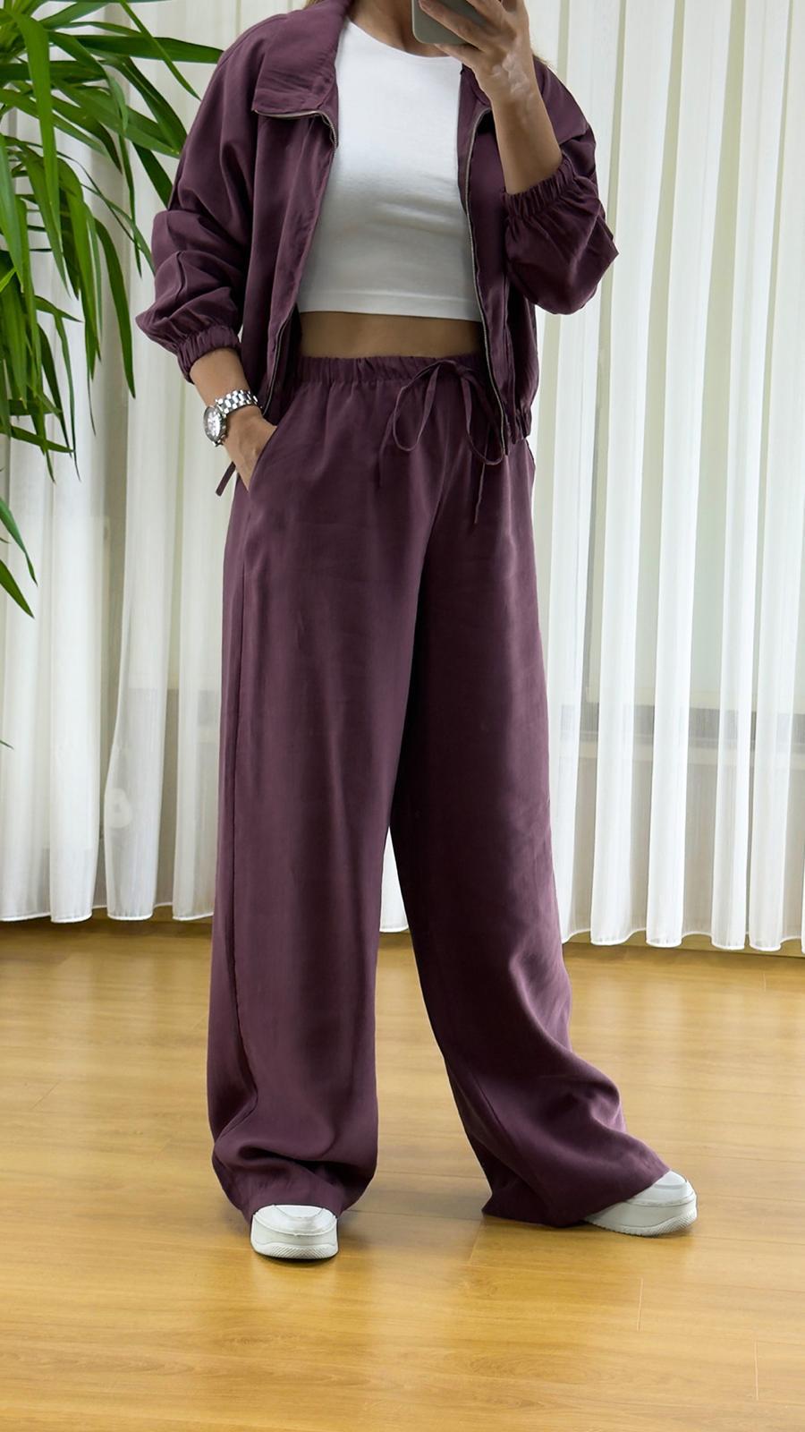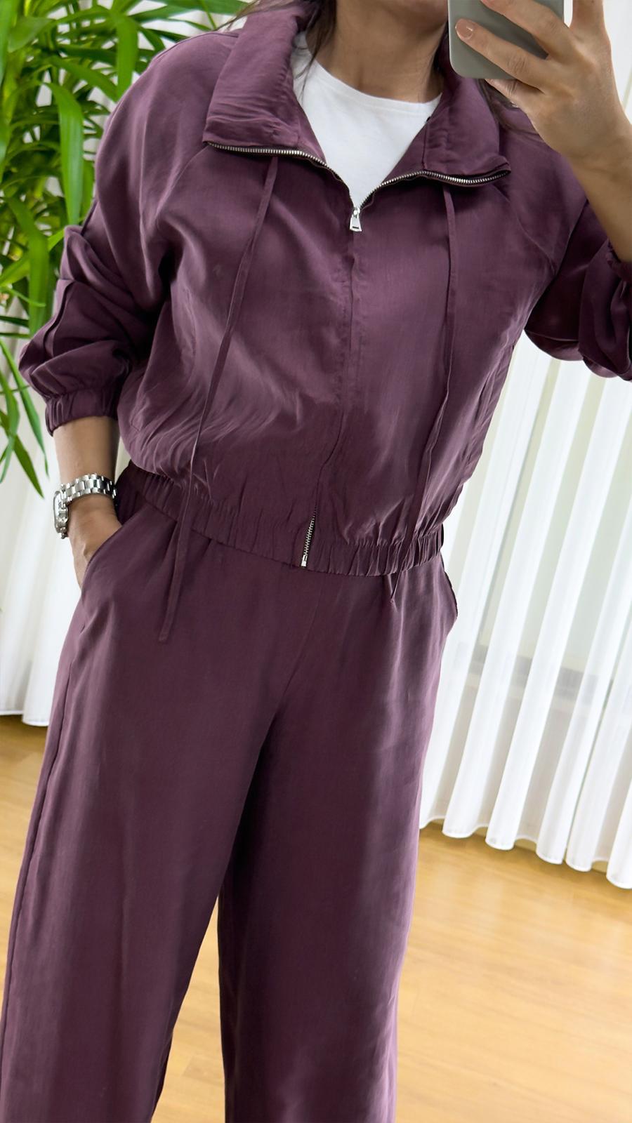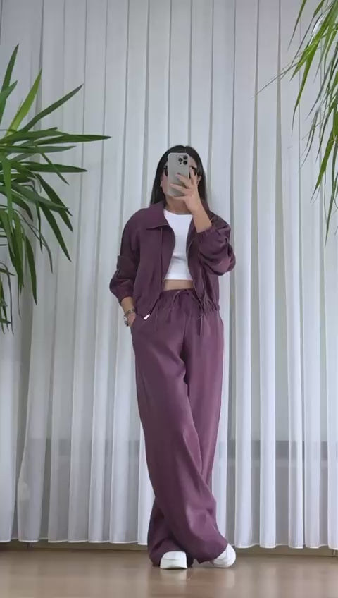 Spor şıklığı seven ve sıradanlıktan kaçan kadınların vazgeçilmezi olan bu mürdüm bomber takım, konfor ve stilin buluştuğu cesur bir parça. Hem evde hem de sokakta rahat ve dikkat çekici görünmek isteyenler için ideal!