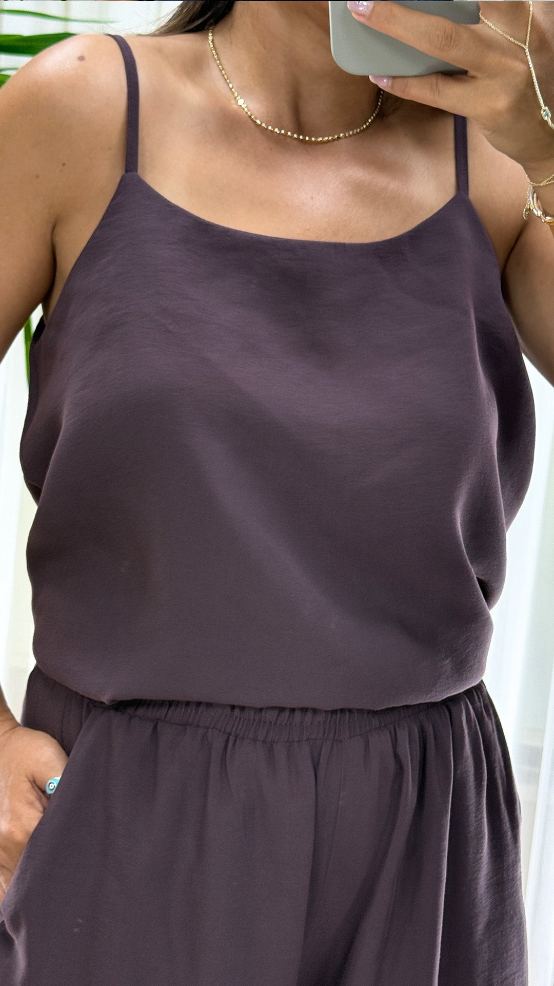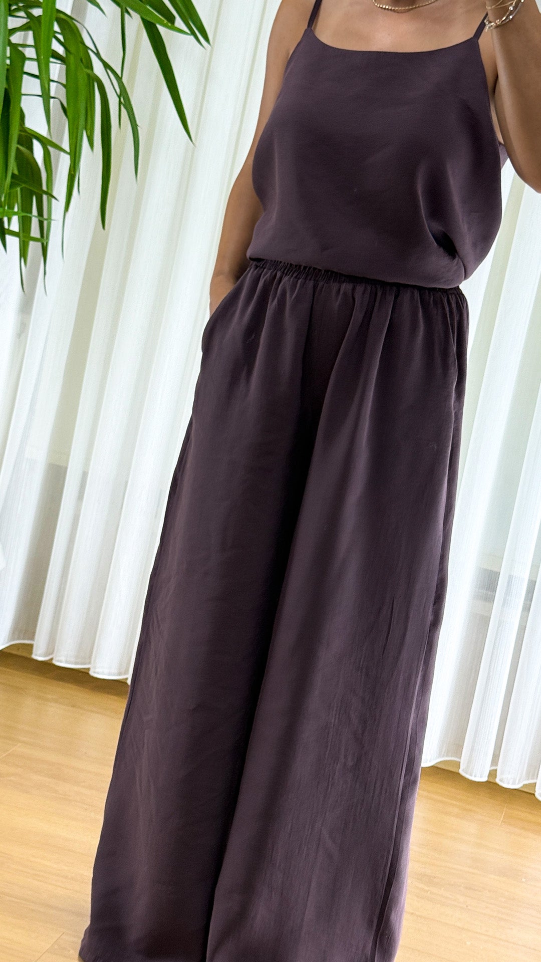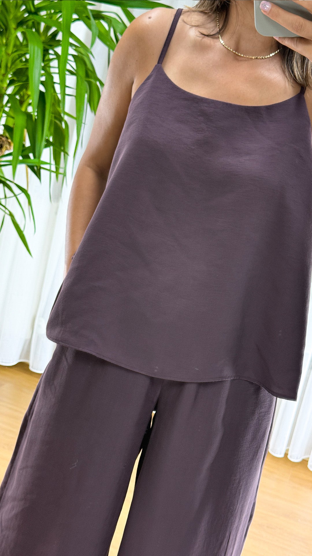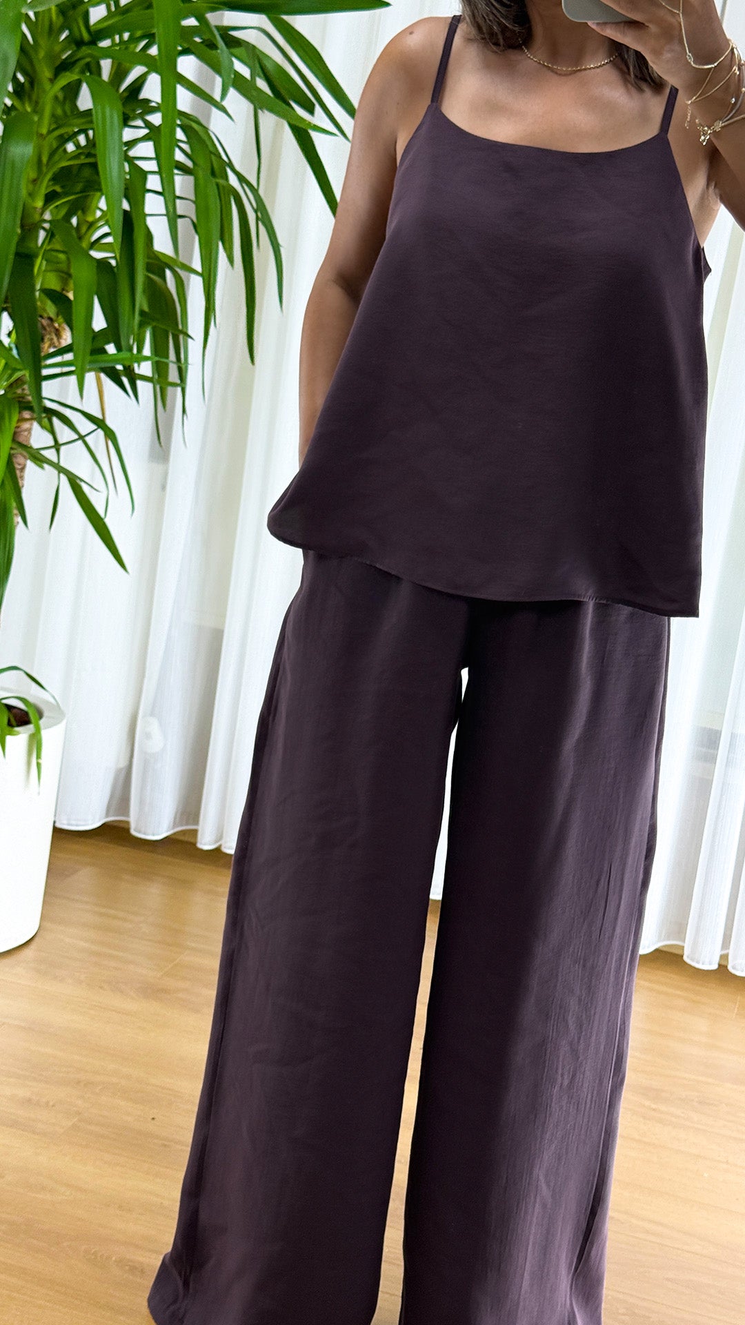 Mürdümün mistik derinliğini tensel kumaşın ipeksi dokusunda buluşturan takımımız, askılı üst ve wide leg pantolon kombinasyonuyla minimal lüksün mükemmel örneğini sunuyor! Soft draping ve breathable tensel ile relaxed elegance yaratıyor.