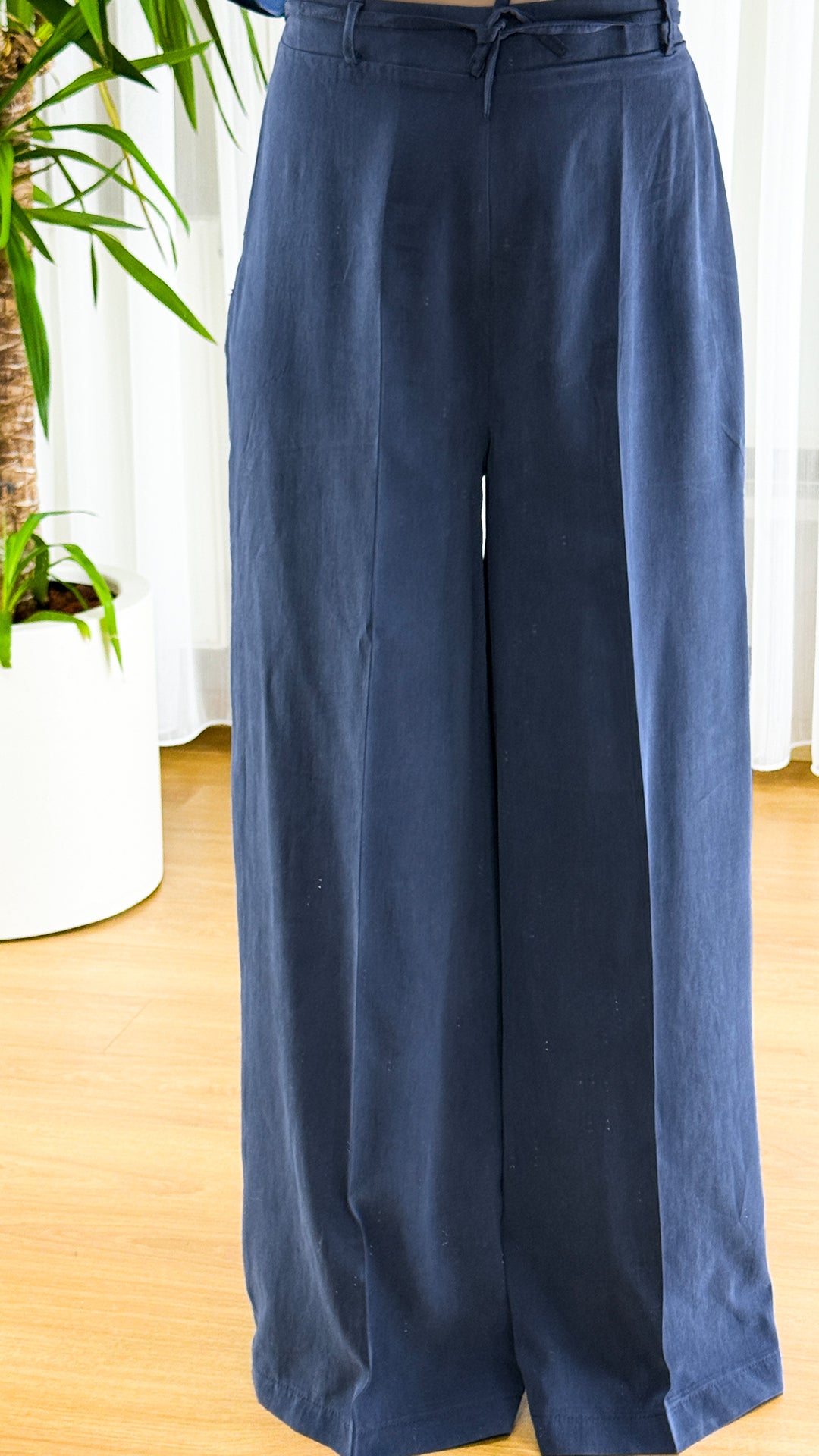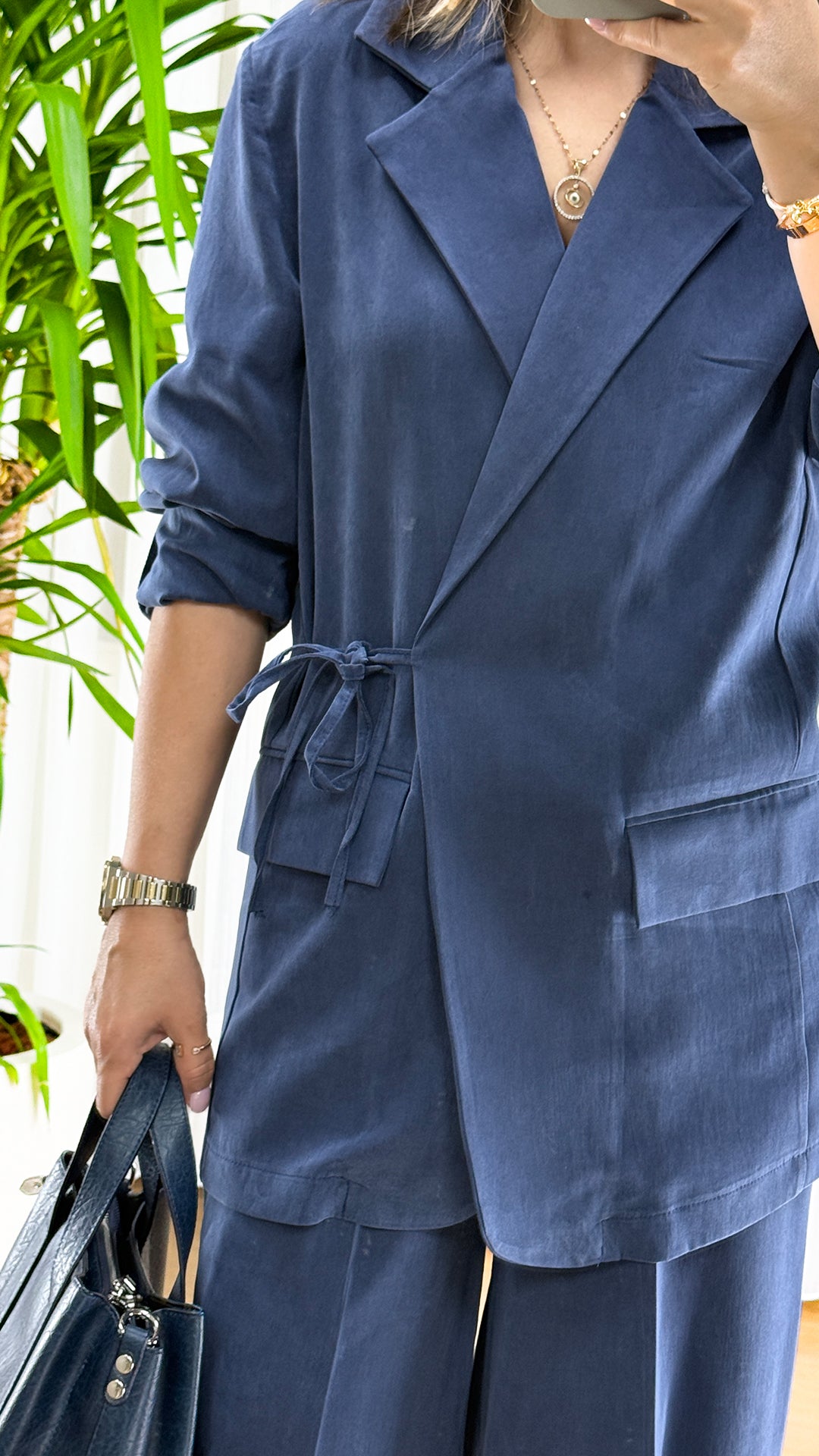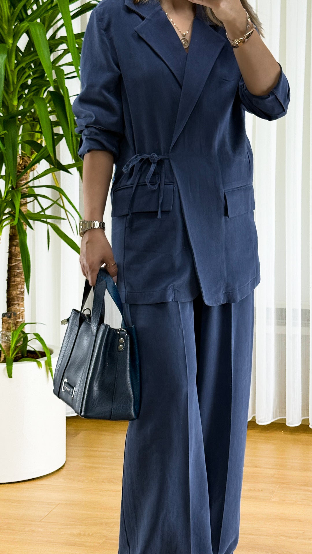 Klasik lacivertin zamansız asaletini viskonun dökümlü güzelliğiyle buluşturan takımımız, blazer ceket ve wide leg pantolon kombinasyonuyla sophisticated office wear'ın mükemmel örneğini sunuyor! Wrap style blazer ve beli bağlamalı detaylarla, feminine power dressing'in modern temsilcisi.