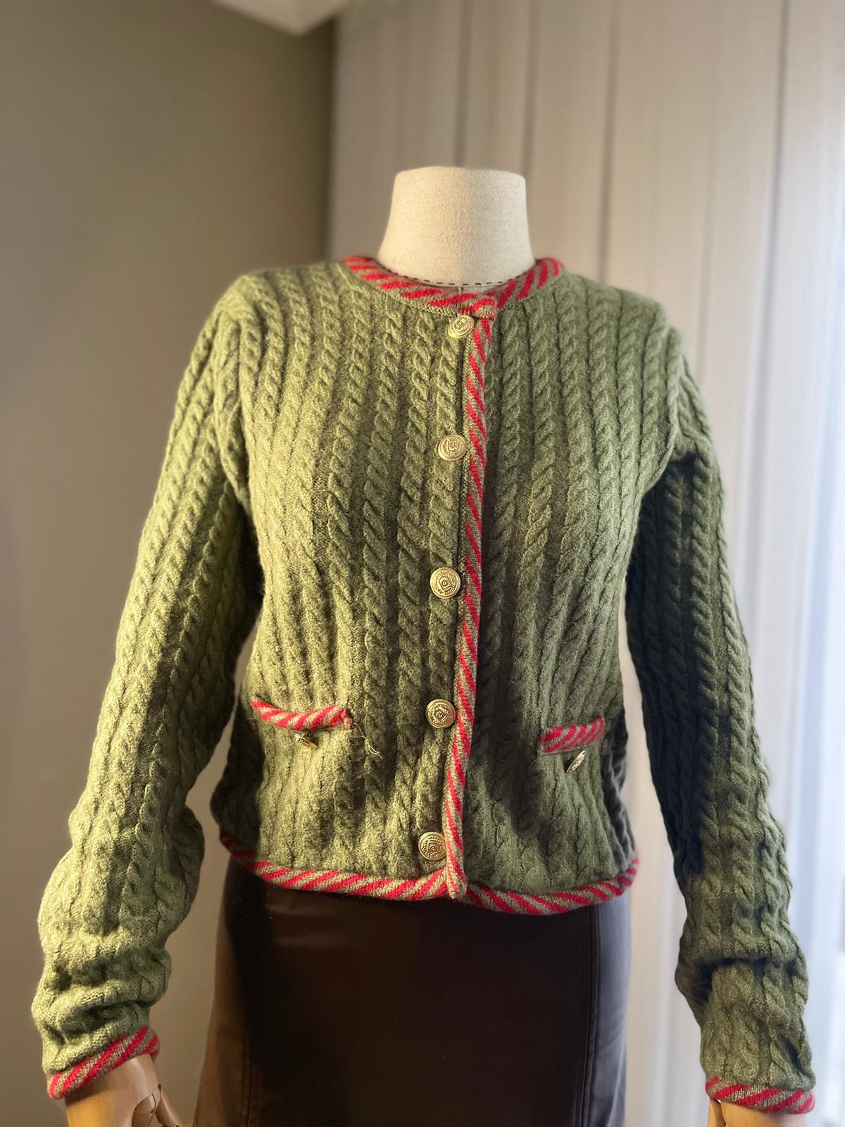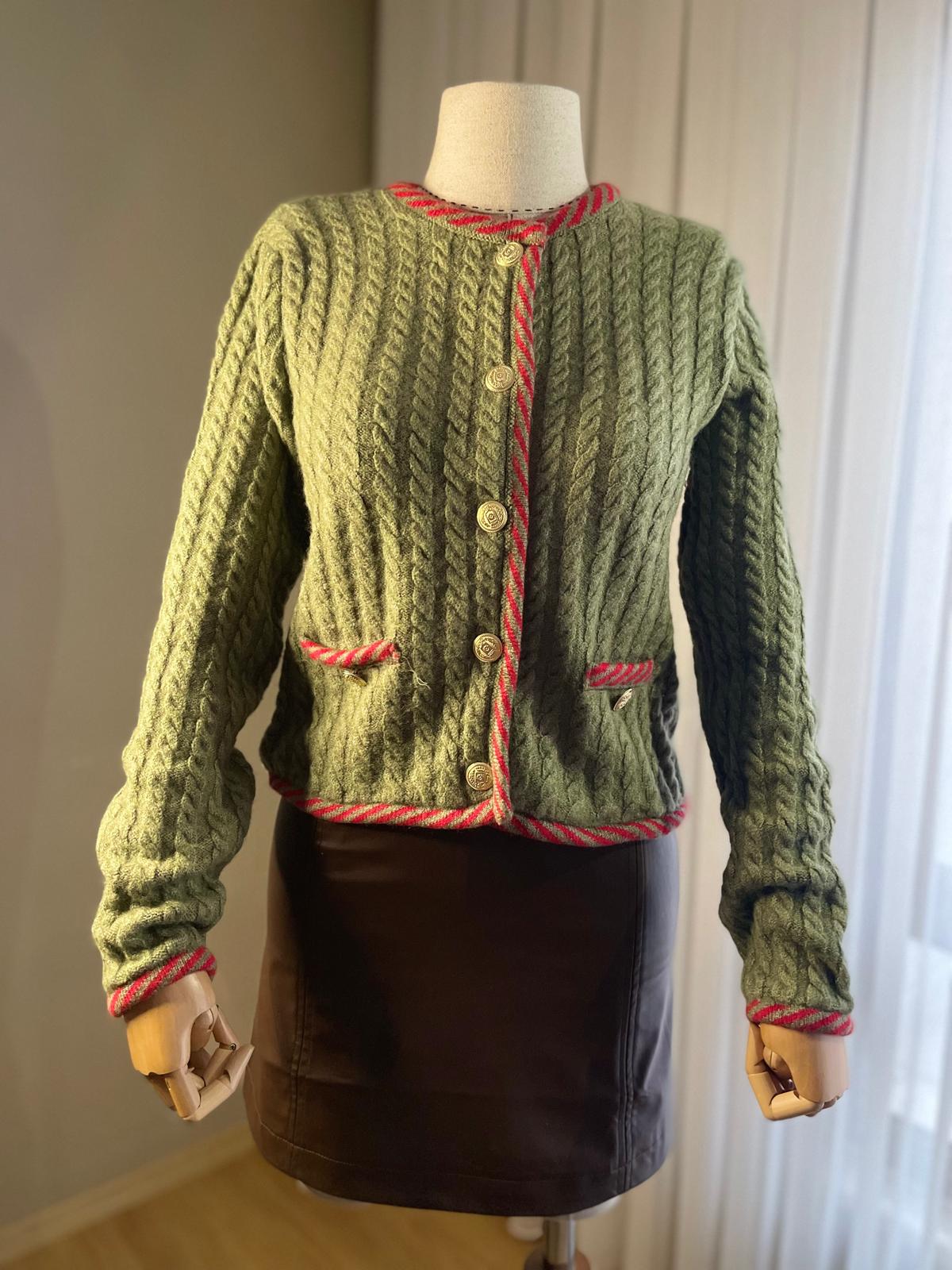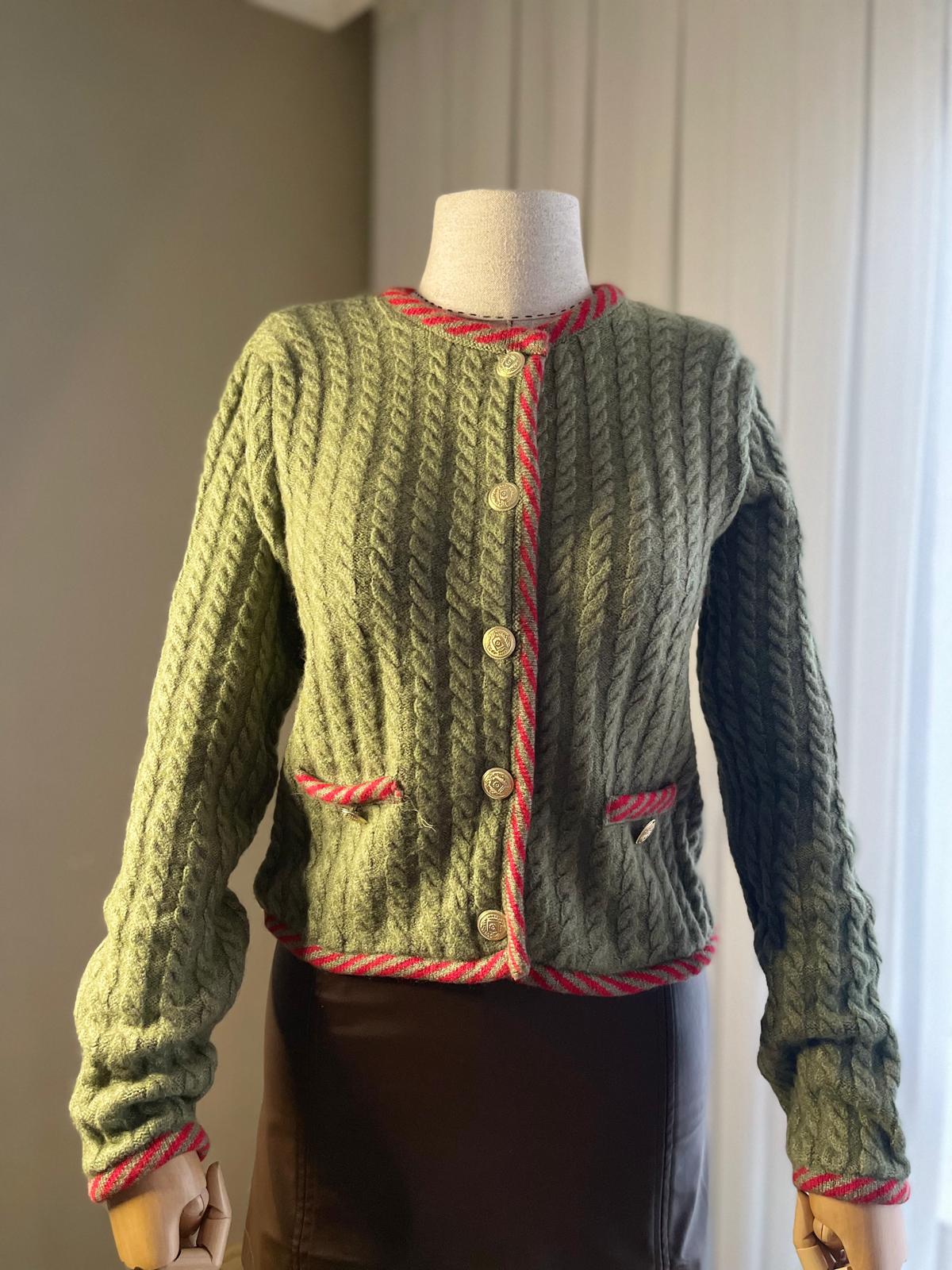 Retro Esintili Yeşil Kırmızı Şeritli Hırka | Vintage Dokunuşlu Modern Tasarım