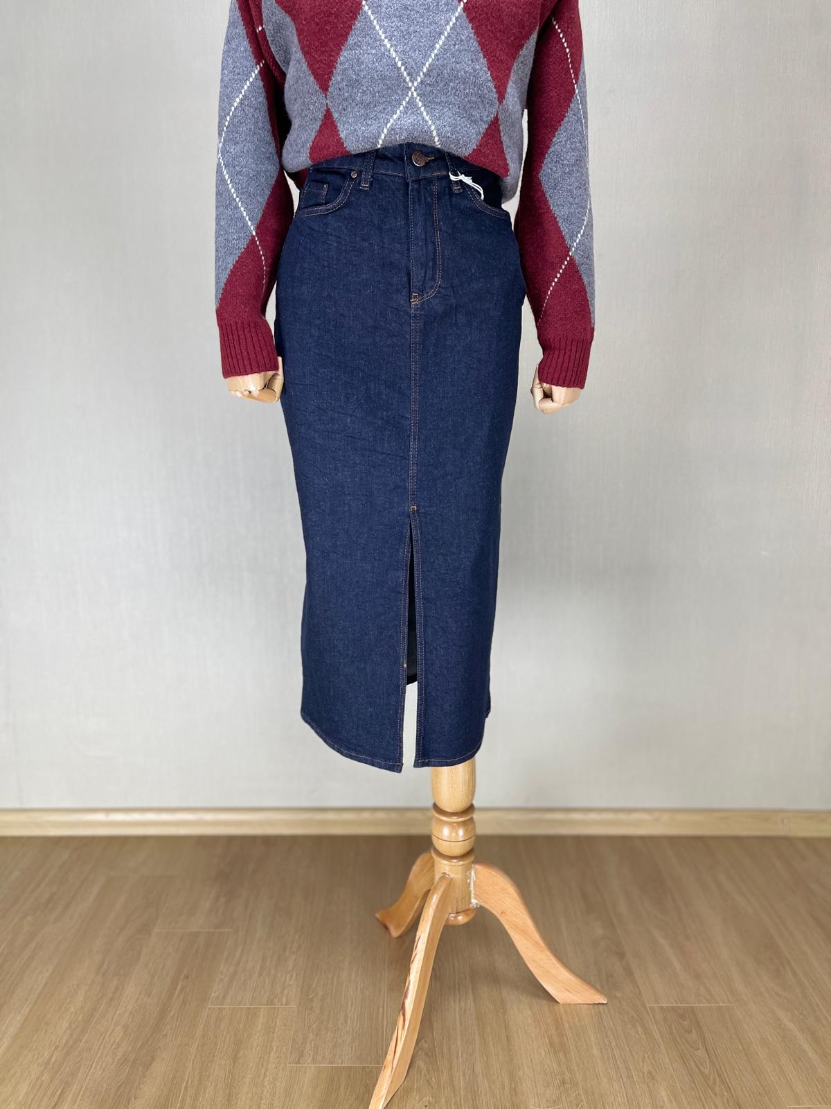 Premium denim kumaşı ve koyu mavi yıkamasıyla öne çıkan bu etek, yüksek bel kesimi sayesinde bacaklarınızı daha uzun gösteriyor. Önündeki yırtmaç detayı hareket kolaylığı sağlarken, klasik beş cep tasarımı ve kontrastlı dikişleriyle autentik bir görünüm sunuyor.
