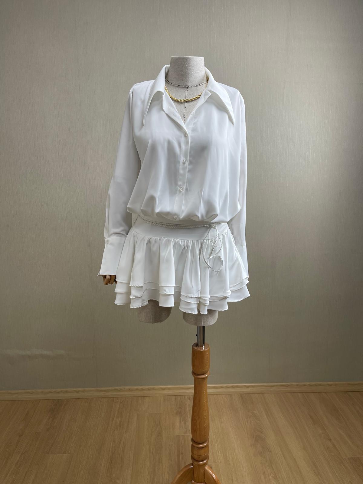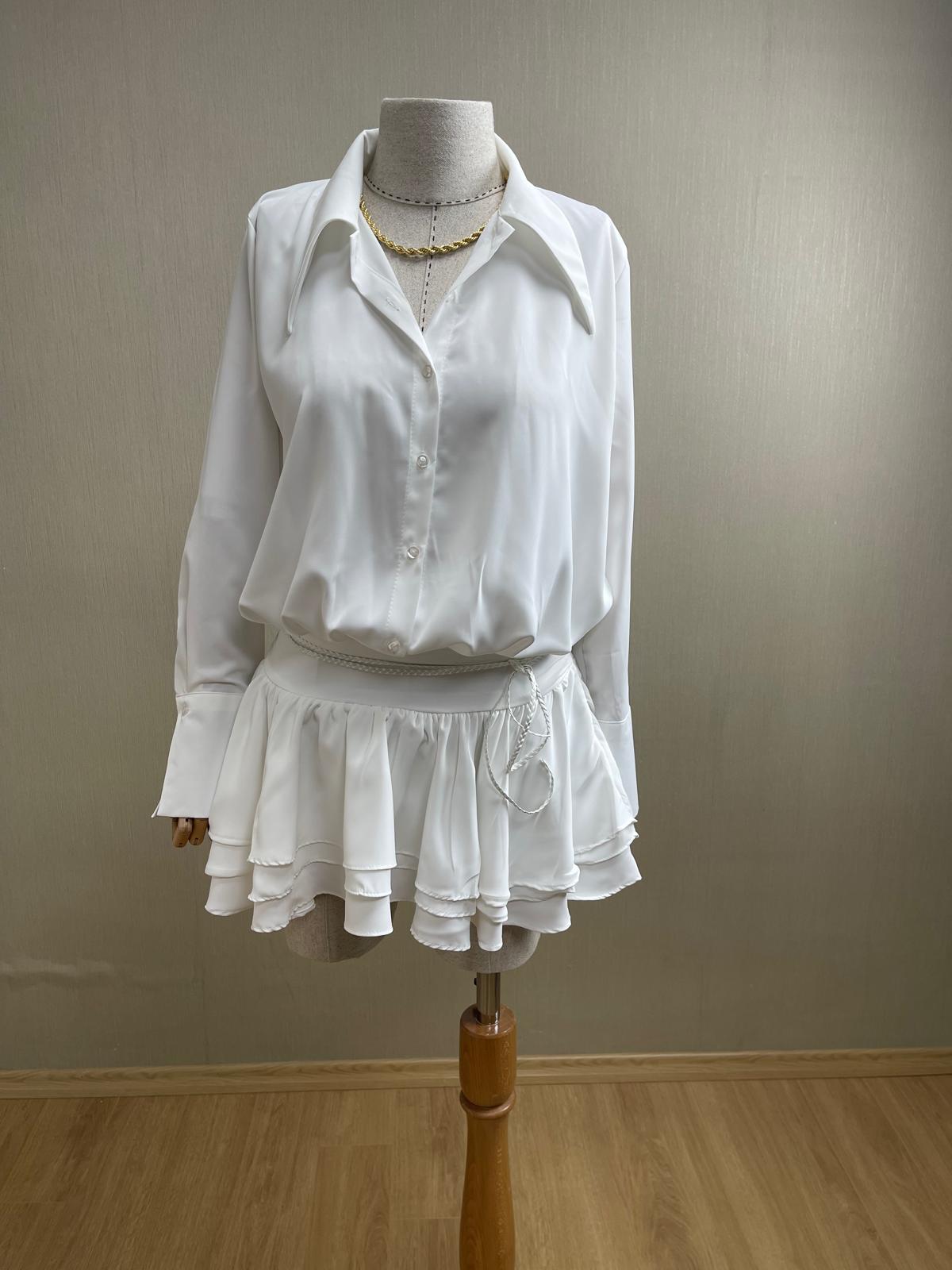 Klasik gömlek tasarımını romantik detaylarla buluşturan beyaz gömlek elbisemiz, zarafeti yeniden tanımlıyor! Üst kısmında klasik gömlek detayları, alt kısmında ise katlı volanlarıyla büyüleyici bir görünüm sunuyor.