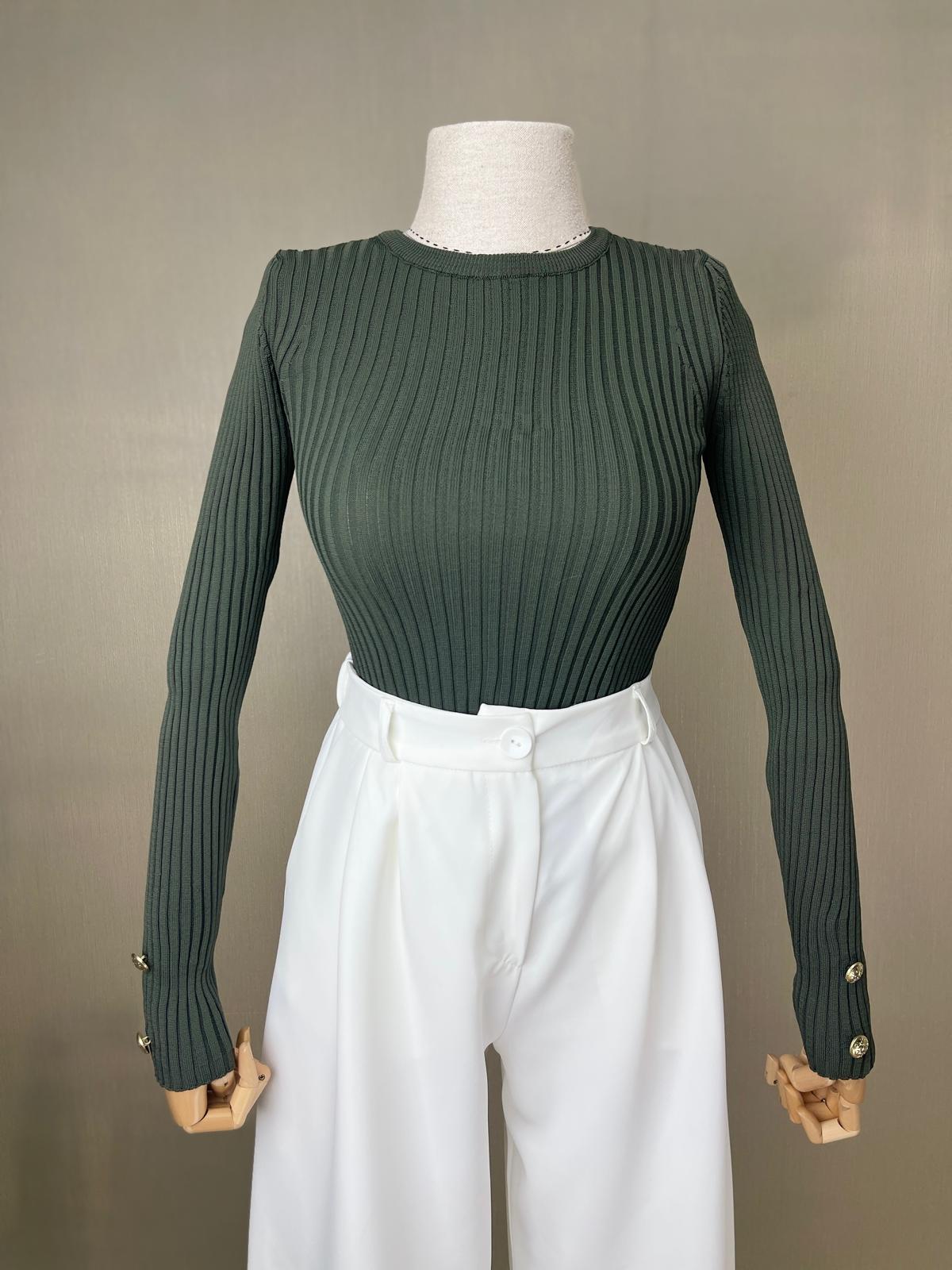 Sonbahar-kış sezonunun trend rengi haki ile buluşan fitilli trikomuz, modern tasarımı ve şık detaylarıyla göz dolduruyor! İnce fitil örgüsü ve vücudu saran kesimi ile zarif bir görünüm vadediyor.