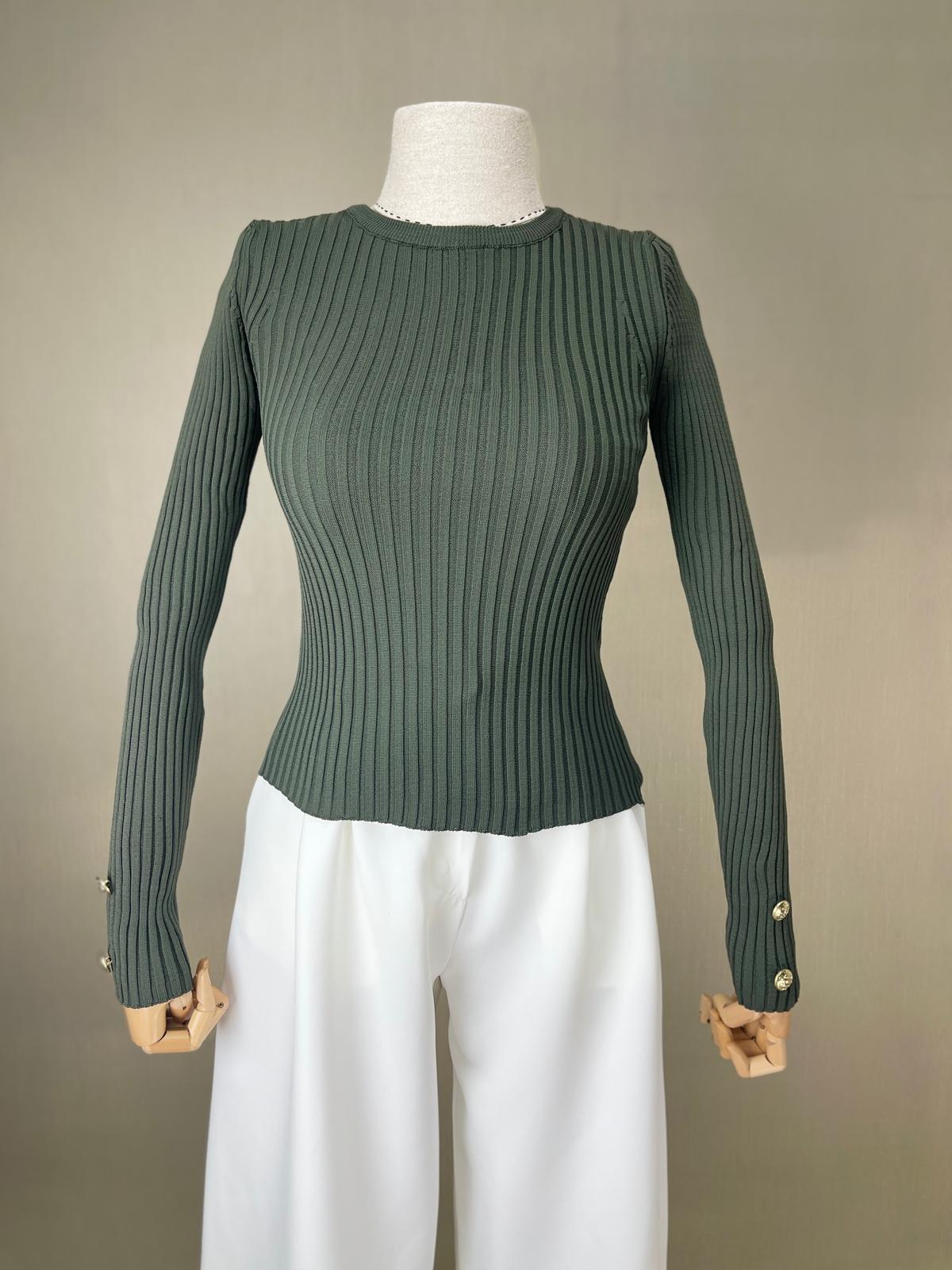 Haki rengin doğal tonları ve fitilli örgü tekniği bir araya gelerek her kombinde fark yaratmanızı sağlayacak. İnce triko dokusu sayesinde hem tek başına hem de ceketlerin altına giyebilirsiniz.
