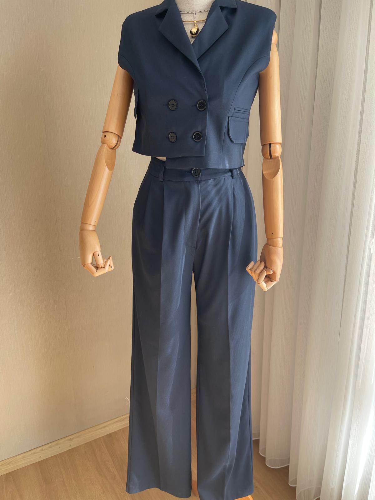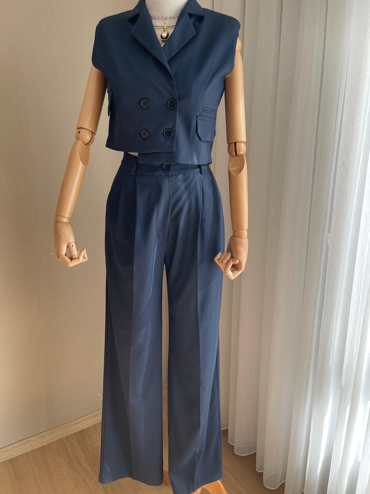 Şıklığın Zirvesi: Lacivert Palazzo Pantolon ve Vatkalı Crop Yelek Takımı