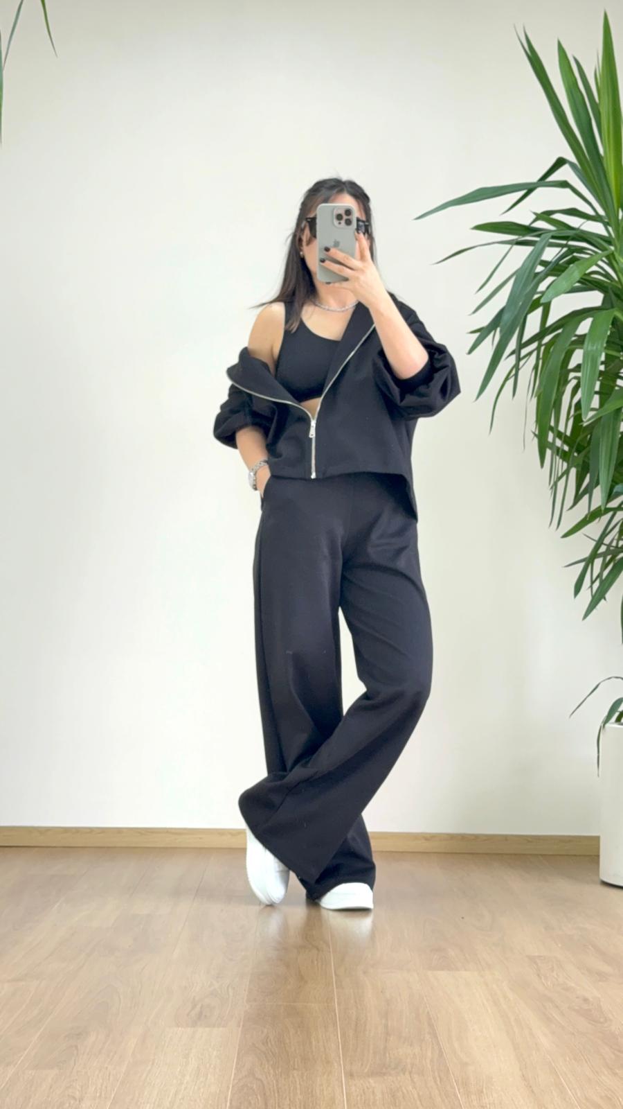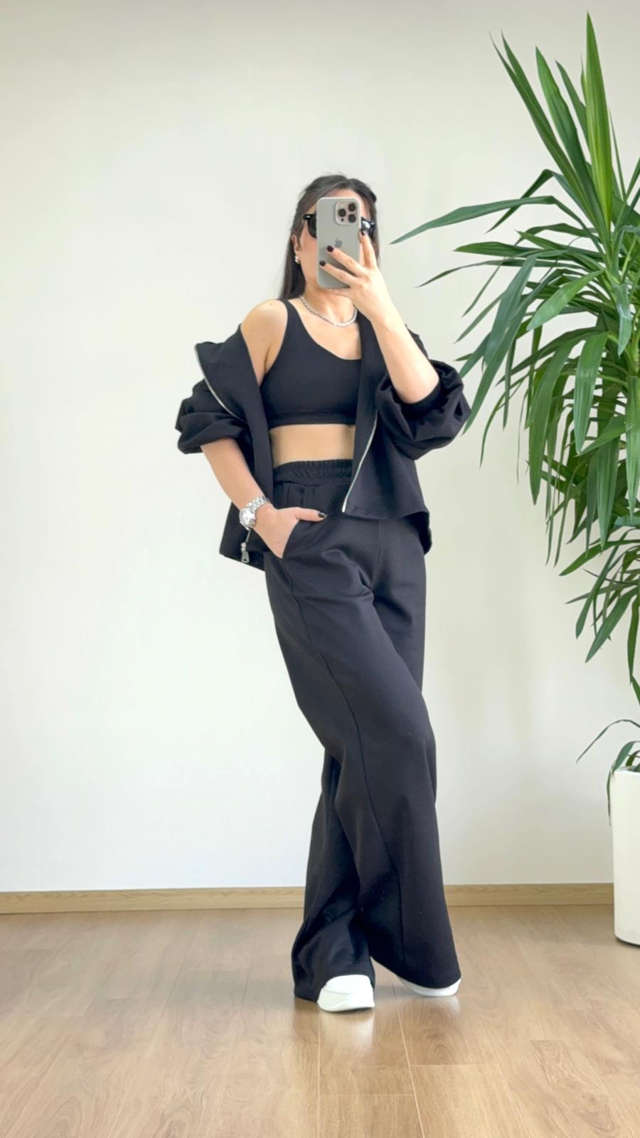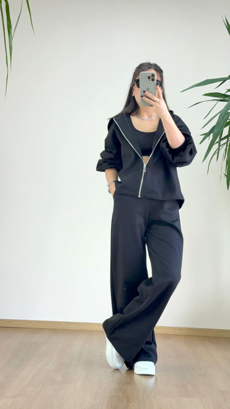 Modern kadının stil anlayışı artık yalnızca şık görünmekle sınırlı değil; aynı zamanda rahat, özgür ve güçlü hissetmek de ön planda. Siyah tonlarının sofistike etkisini taşıyan bu 3’lü eşofman takımı, tam olarak bu beklentiye cevap veren zamansız bir parça olarak öne çıkıyor. Günlük stiline zahmetsiz bir cool tavır kazandırmak isteyenler için tasarlanan bu kombin, sade ama etkileyici duruşuyla fark yaratıyor.