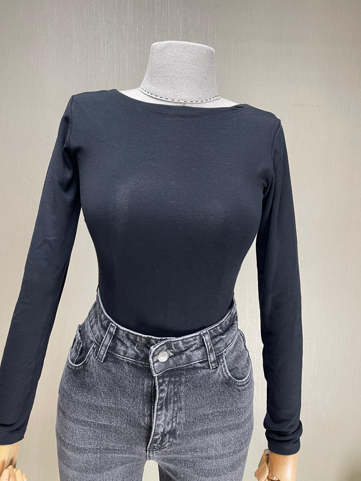 Siyah Kayık Yaka Basic Body - Uzun Kollu