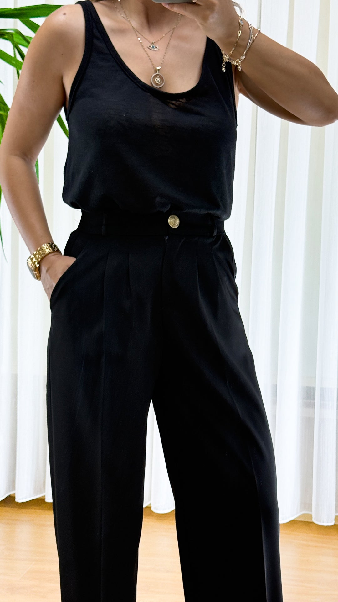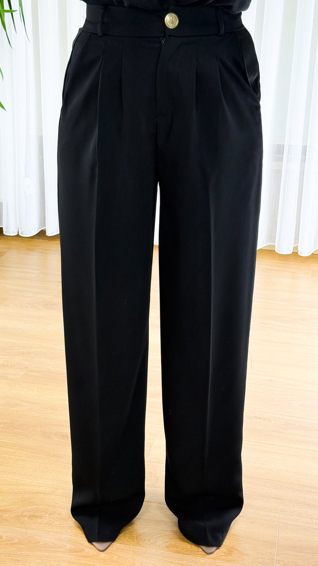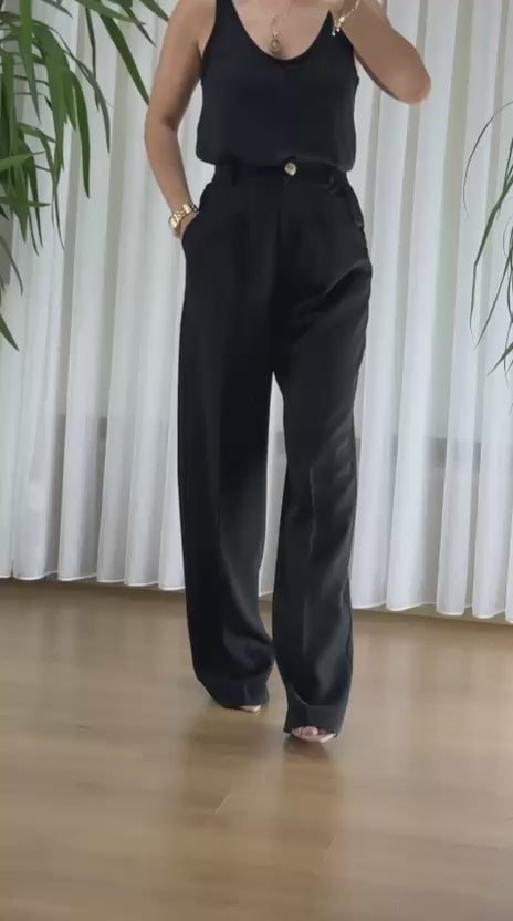 Bel kısmındaki zarif pileler structured bir görünüm yaratırken, palazzo kesimin akışkan hareketi maksimum konfor sağlıyor. Altın rengi düğme detayı ve premium kumaş kalitesi, pantolona lüks bir dokunuş katıyor. Yüksek bel tasarımı bacakları uzun gösterirken, siyah rengin slimming etkisi kusursuz bir siluet oluşturuyor.