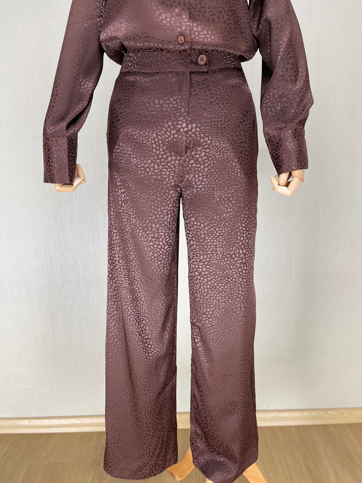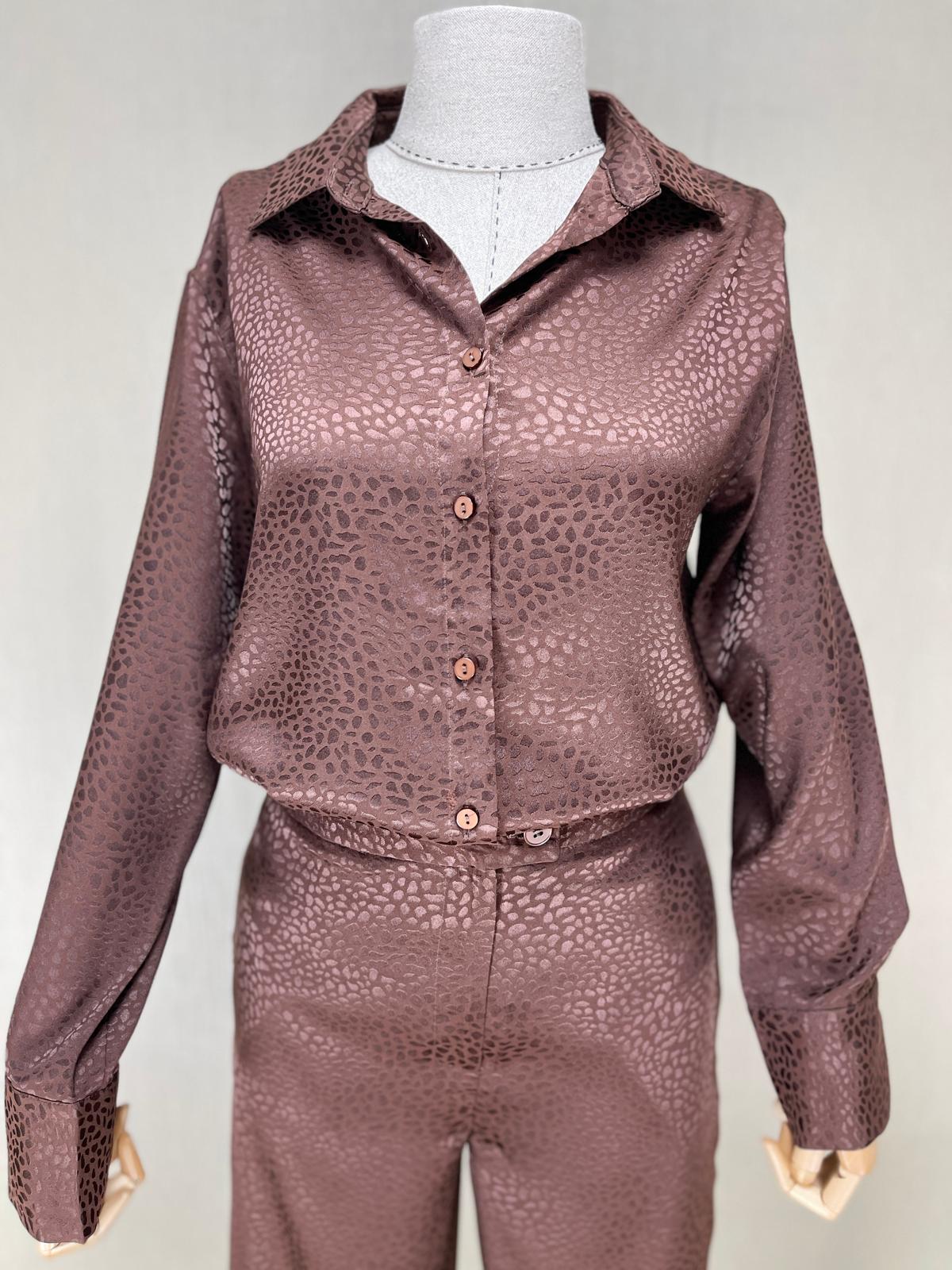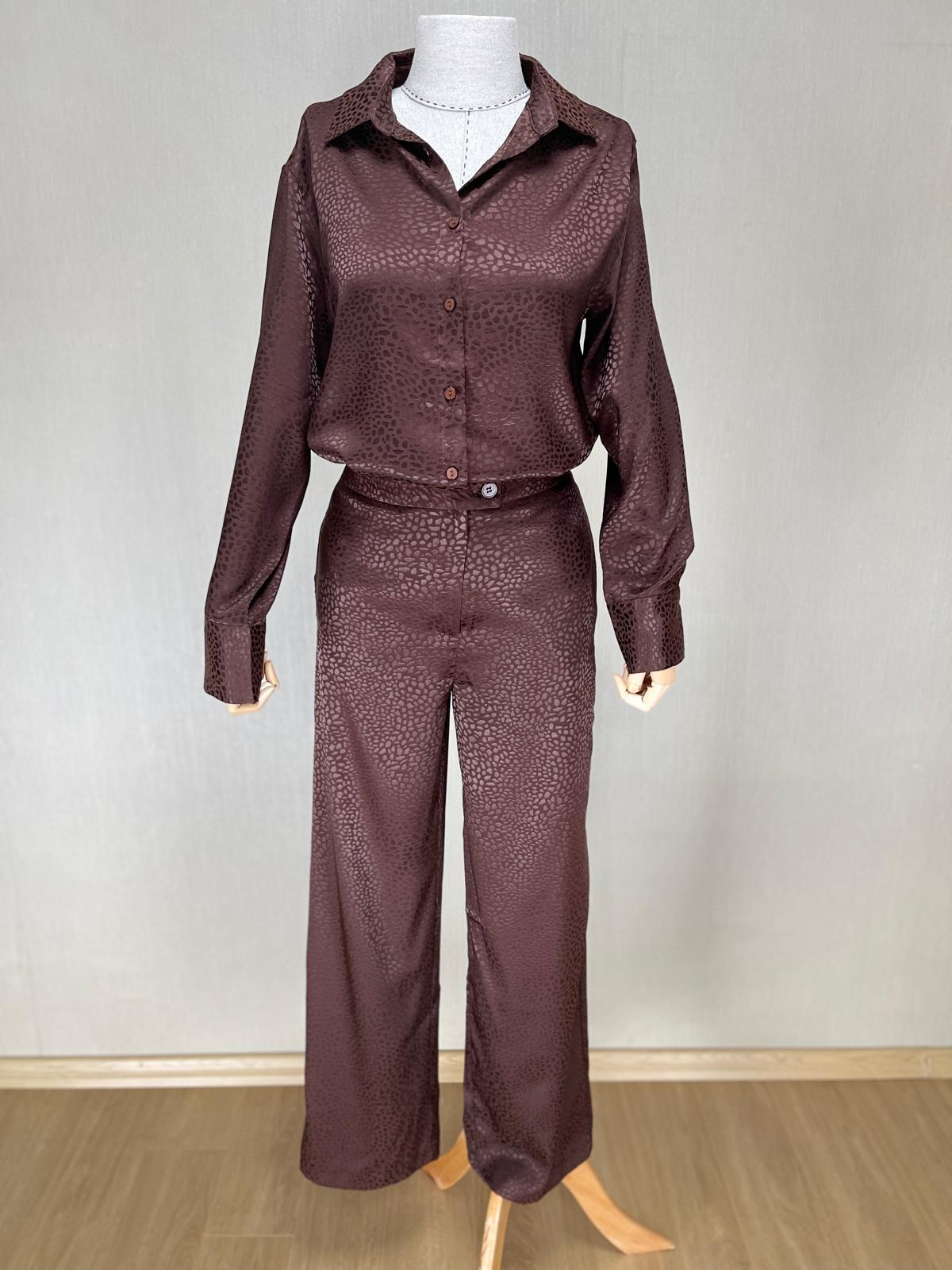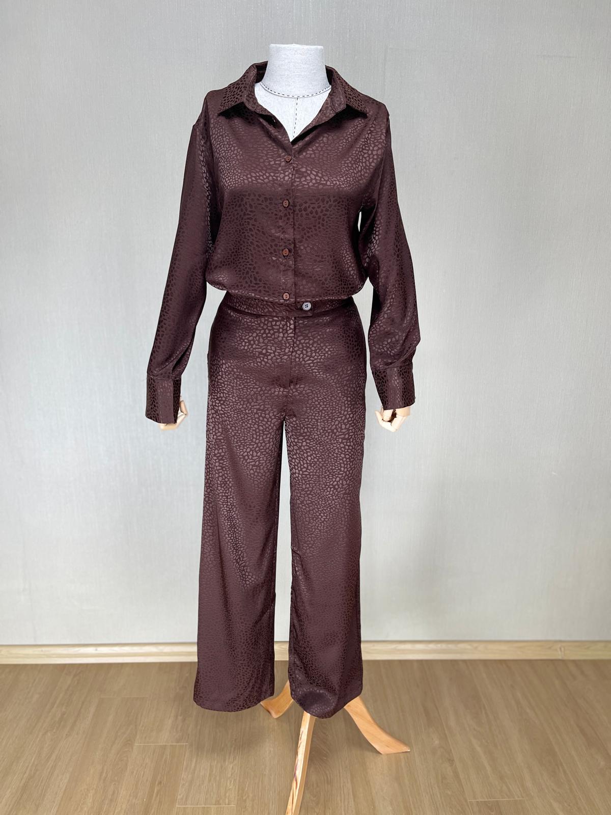 Sezonun en trend parçalarından olan kahverengi jakarlı saten takımımız, şık deseni ve modern kesimiyle göz kamaştırıyor! Gömlek ve bol paça pantolon kombininden oluşan bu set, hem gündüz hem gece şıklığı için ideal bir tercih.
