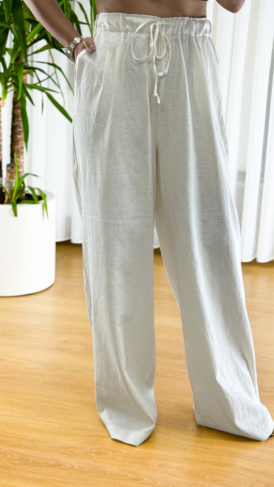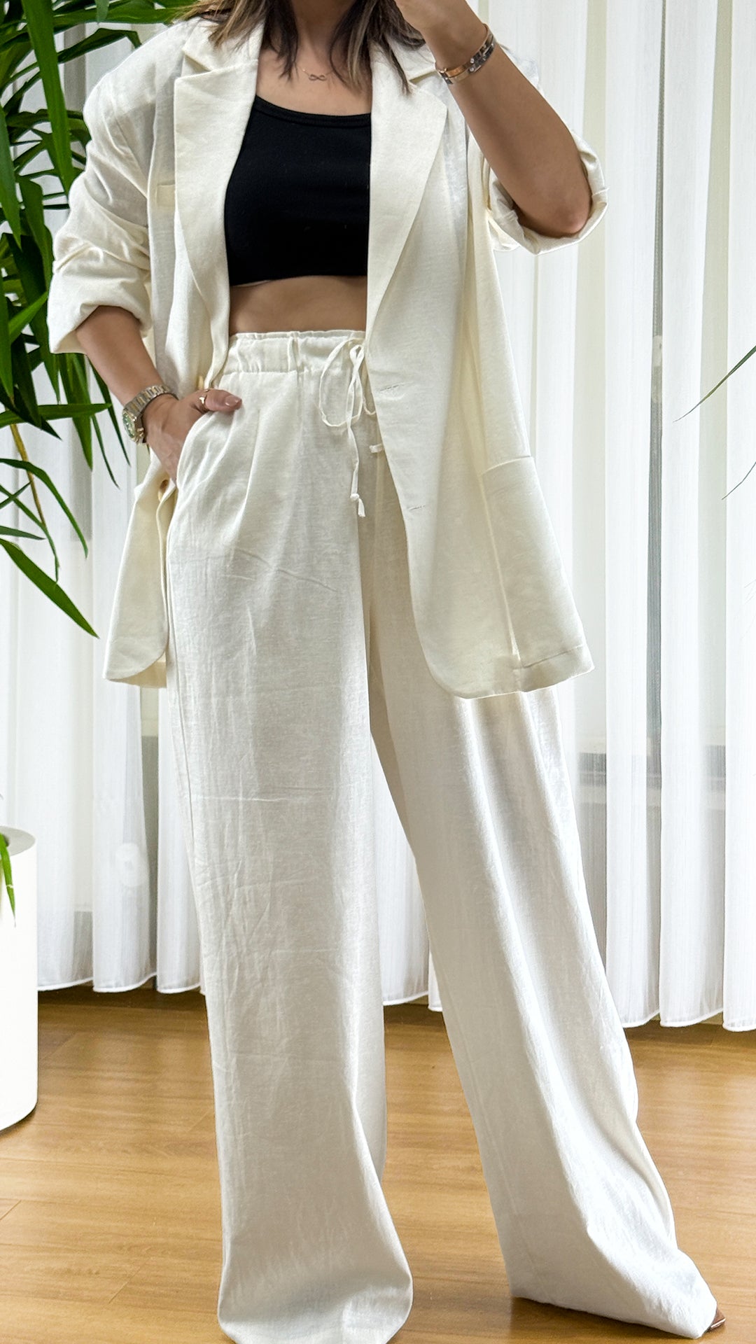 Klasik yakalı blazer, oversize tasarımı ve geniş cepleriyle modern bir duruş sergilerken, beli ayarlanabilir palazzo pantolon maksimum hareket özgürlüğü sağlıyor. Keten kumaşın doğal kırışıklığı ve krem rengin yumuşak tonu, casual luxury stilinin mükemmel temsilcisi.