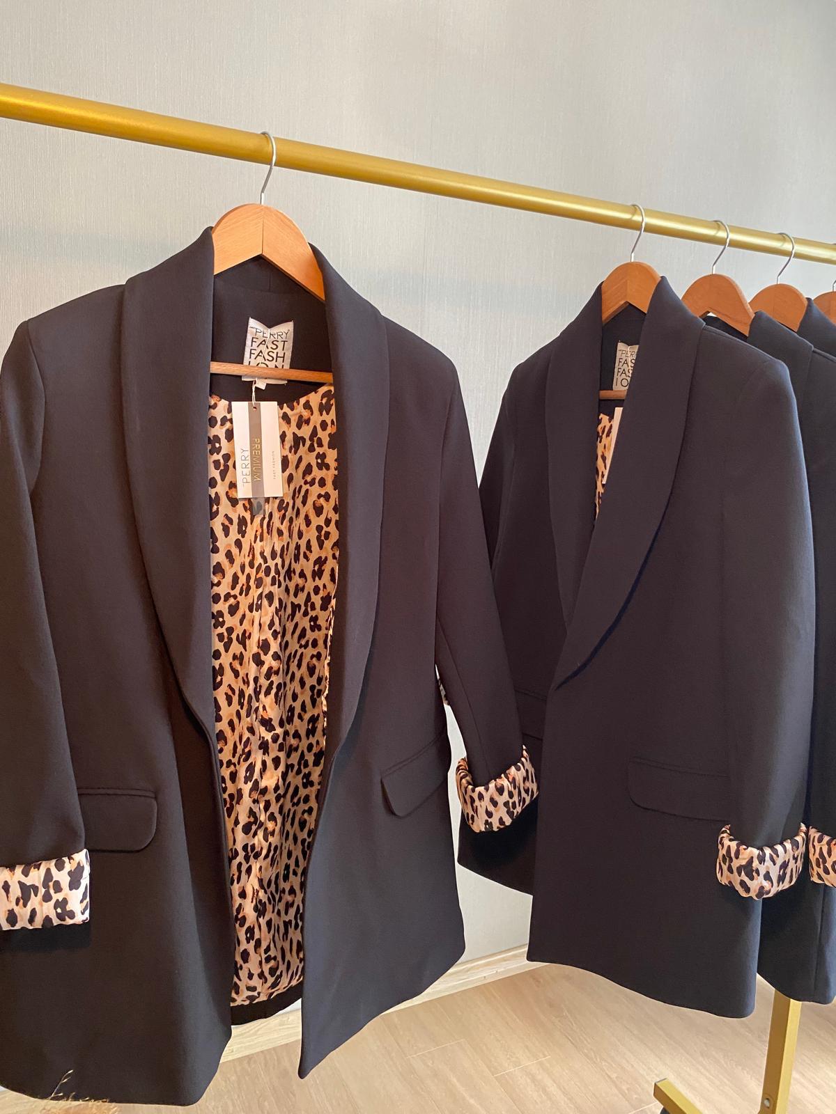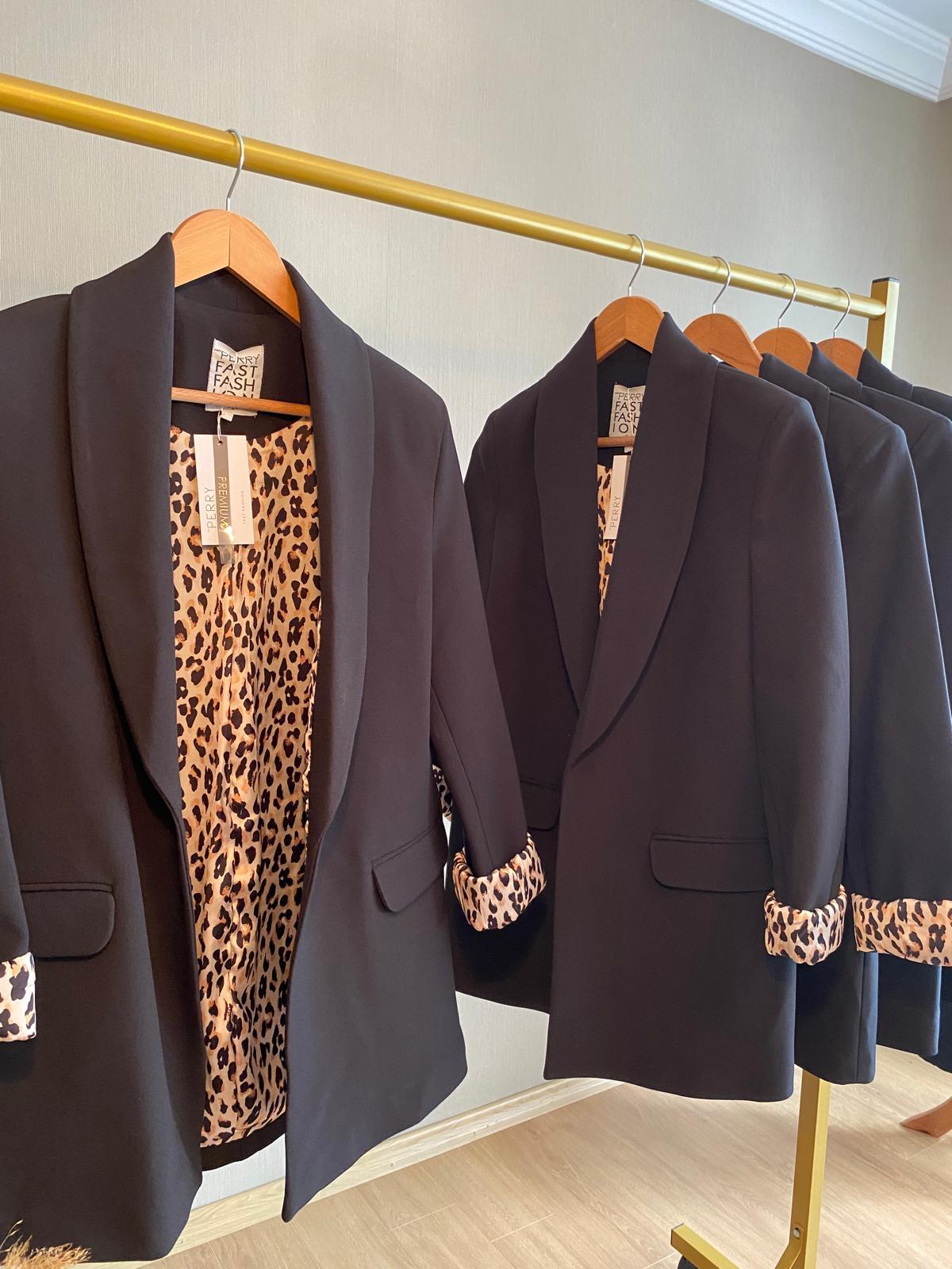 Siyah şal yaka blazer ceketler, klasik tasarımlarıyla profesyonel bir görünüm sağlarken, iç kısımlarındaki ve kol detaylarındaki leopar desenli astar, kıyafete beklenmedik bir heyecan katıyor.