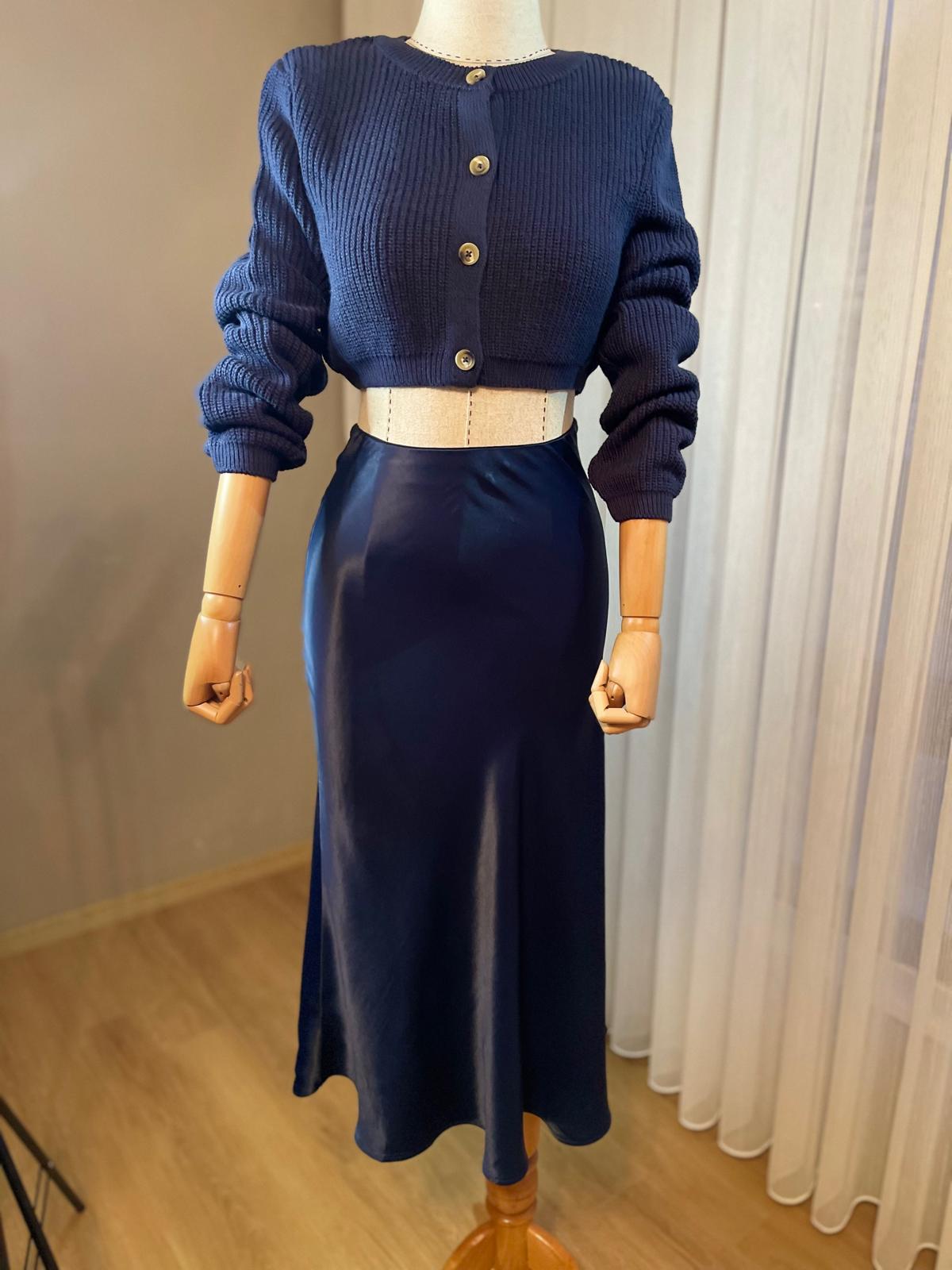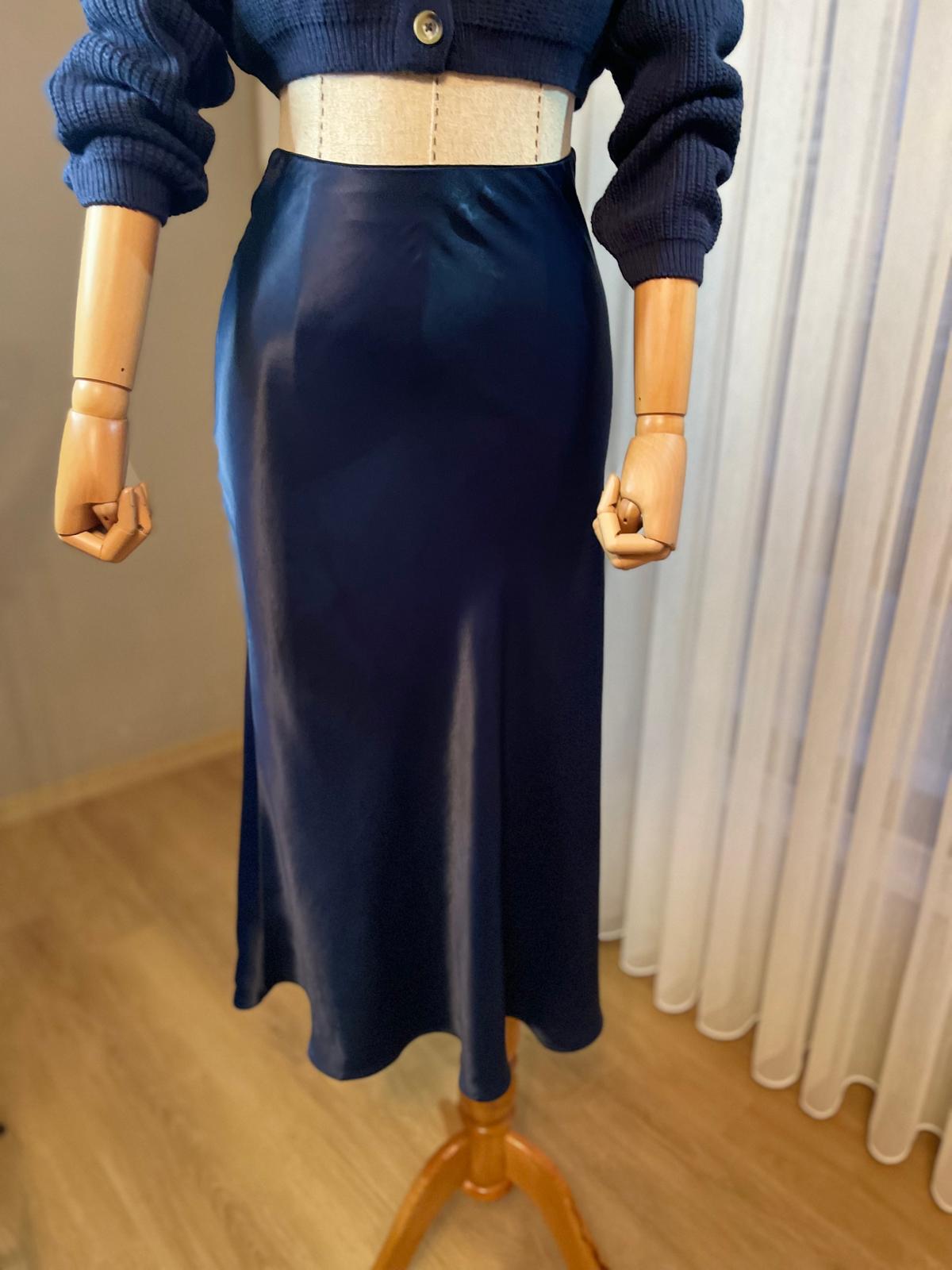 Işıltılı dokusunu zarafetle buluşturan lacivert saten uzun eteğimizle tanışın! Işığın her yansımasında farklı bir güzellik sunan bu parça, göz alıcı duruşuyla tüm bakışları üzerinize çekecek.