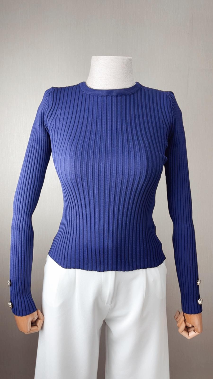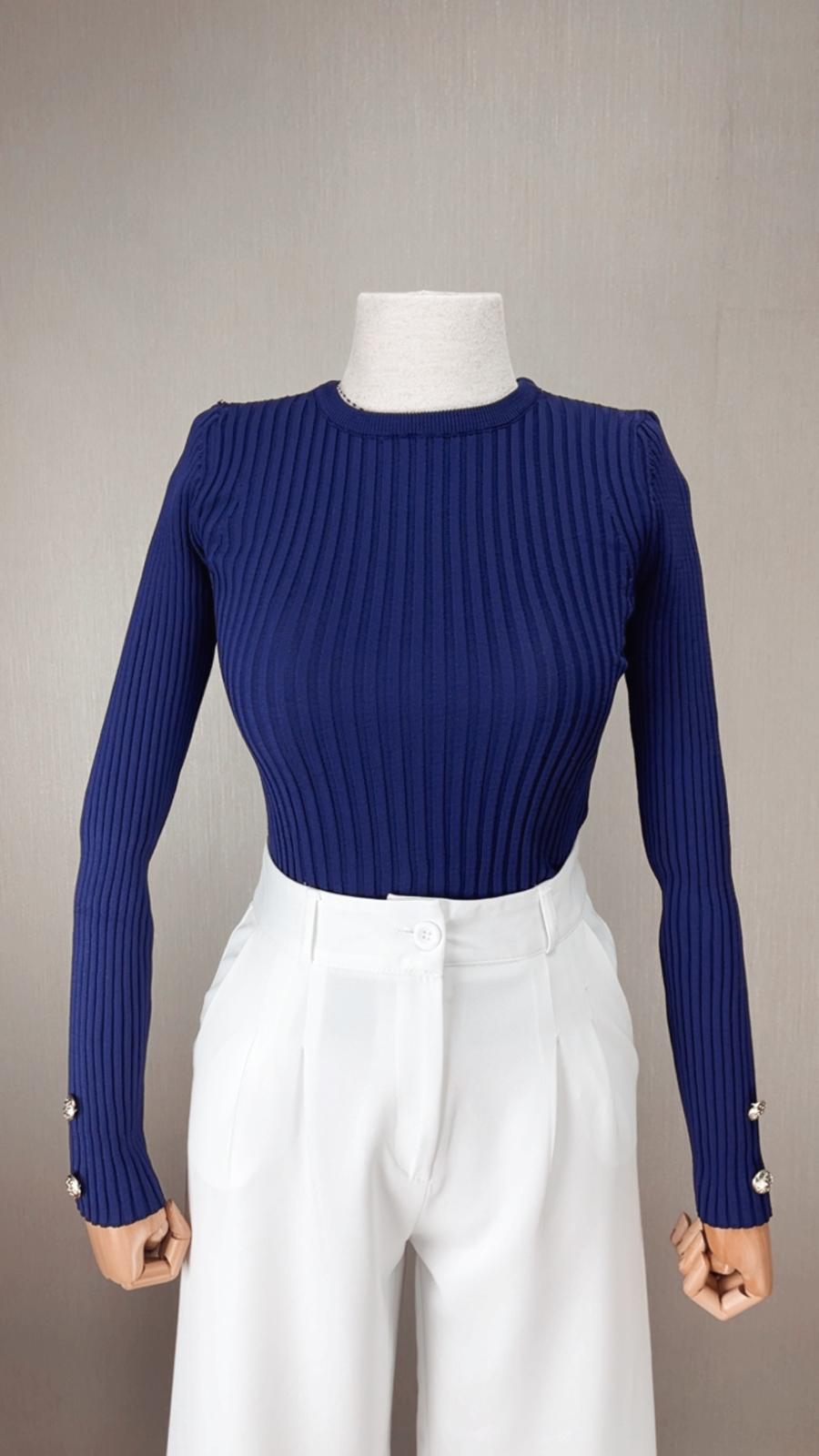 Modern kadının vazgeçilmezi lacivert fitilli trikomuz, vücut hatlarını nazikçe saran kesimi ve özel detaylarıyla dikkat çekiyor! Vatkalı omuz tasarımı ve kol uçlarındaki şık düğme detaylarıyla basic bir parçadan çok daha fazlasını vadediyor.