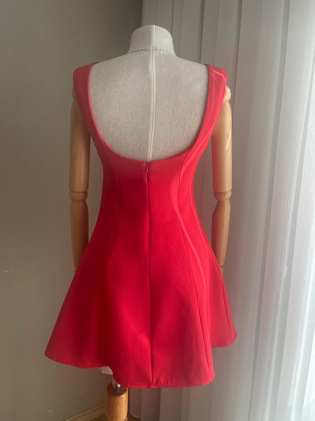 Zarafetin ve özgüvenin simgesi bu göz alıcı kırmızı mini elbise, özel anlarınızın vazgeçilmez parçası olmaya aday. Modern kesimi ve A kesim silueti ile vücut hatlarınızı kusursuz şekilde ortaya çıkarırken, minimal tasarımı sayesinde her türlü aksesuar ve ayakkabı ile kolayca kombinlenebilir.